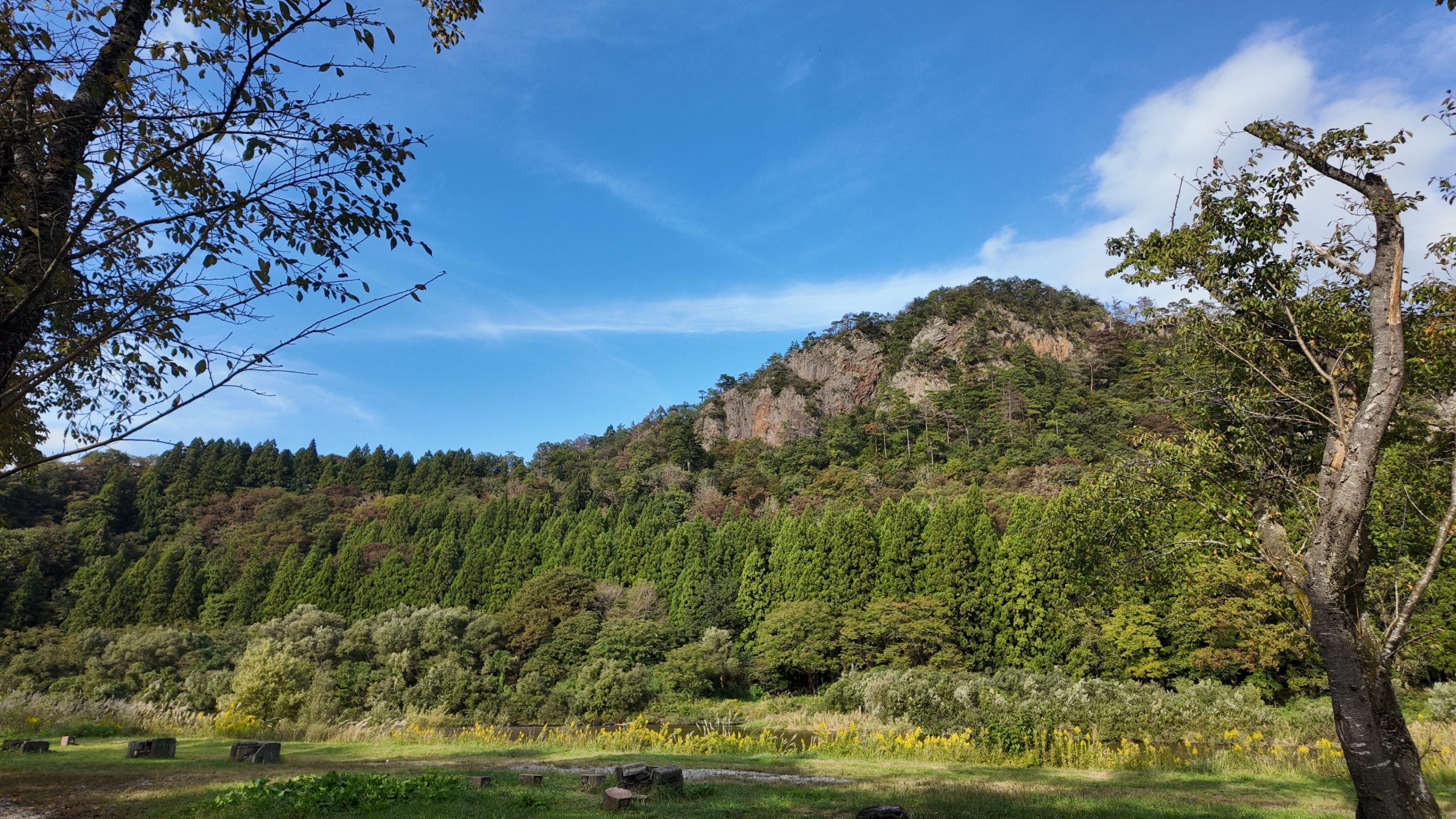 すぐ脇を流れる常浪川のせせらぎや、麒麟山の緑葉や紅葉を愉しみながらキャンプやバーベキューもできる自然豊かなスポットです。