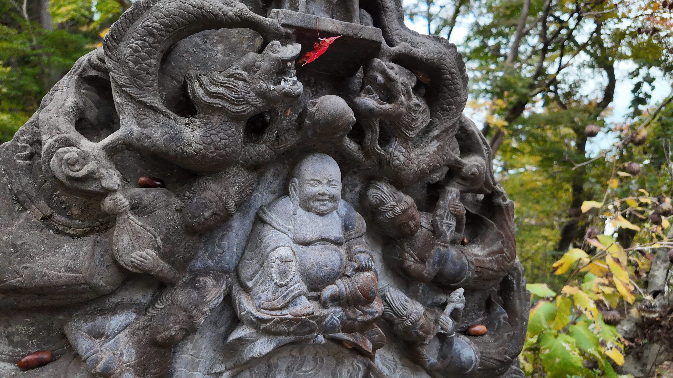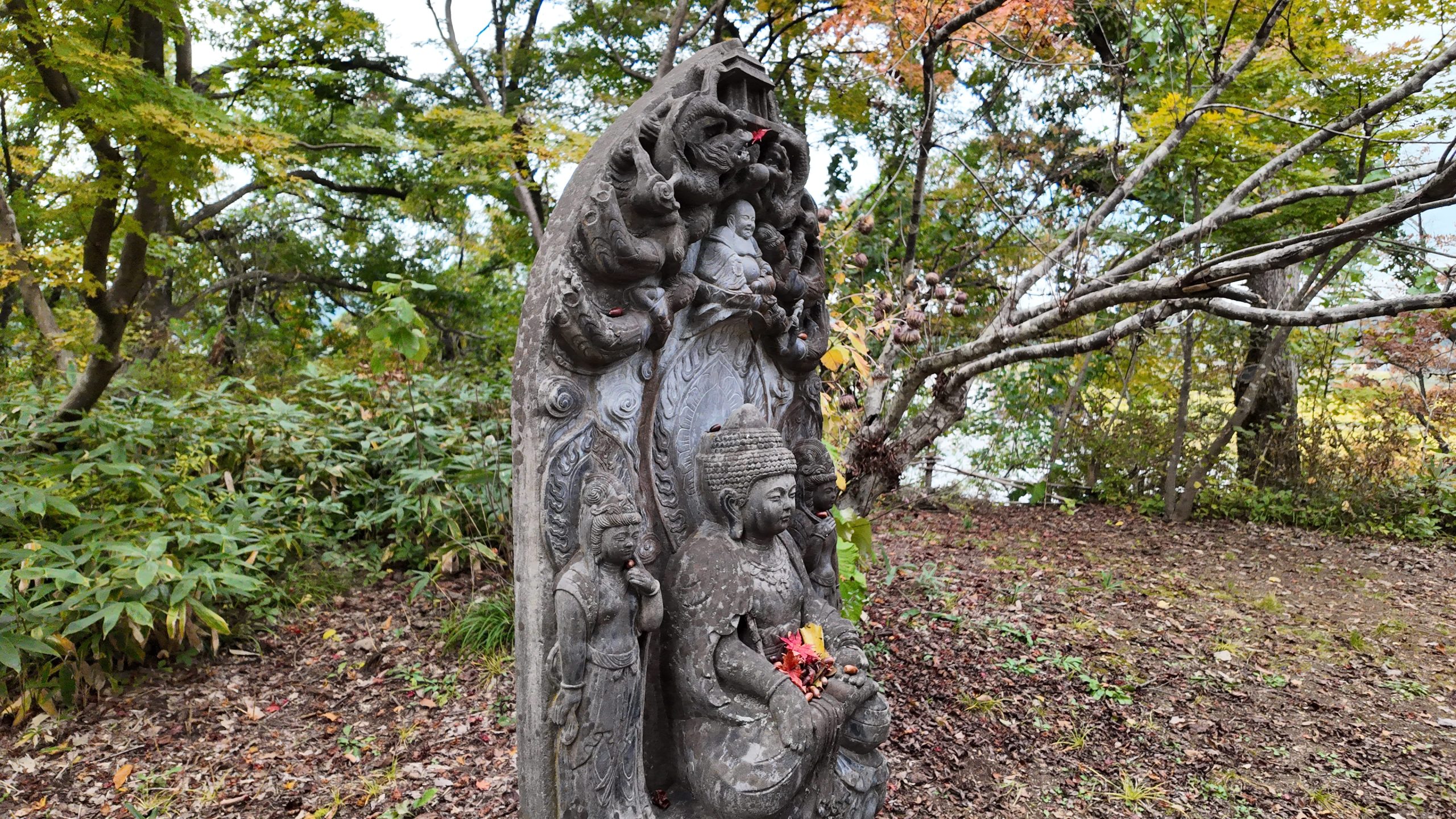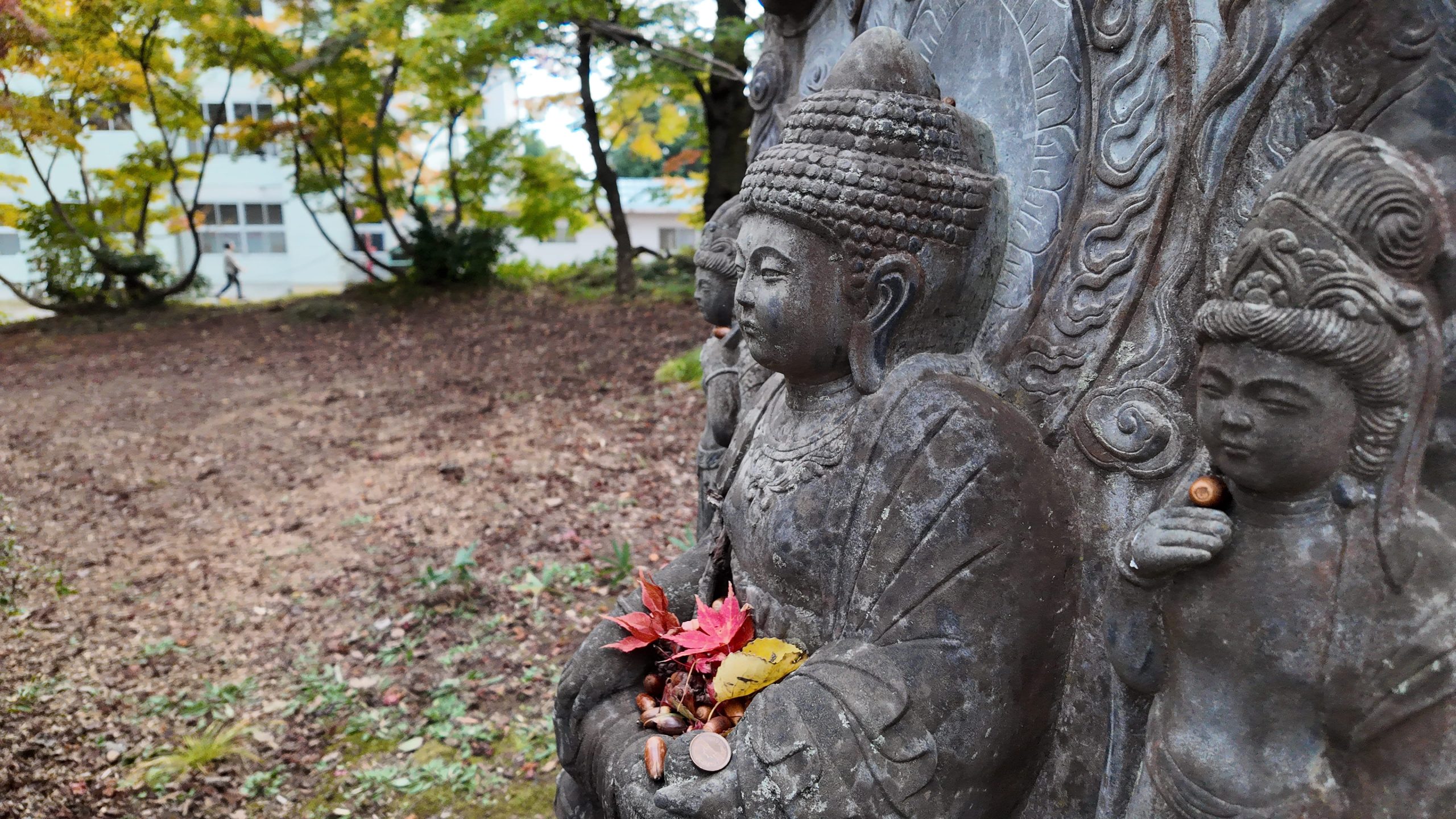 一部の像にはお供え物のようにドングリやモミジが置かれていました。