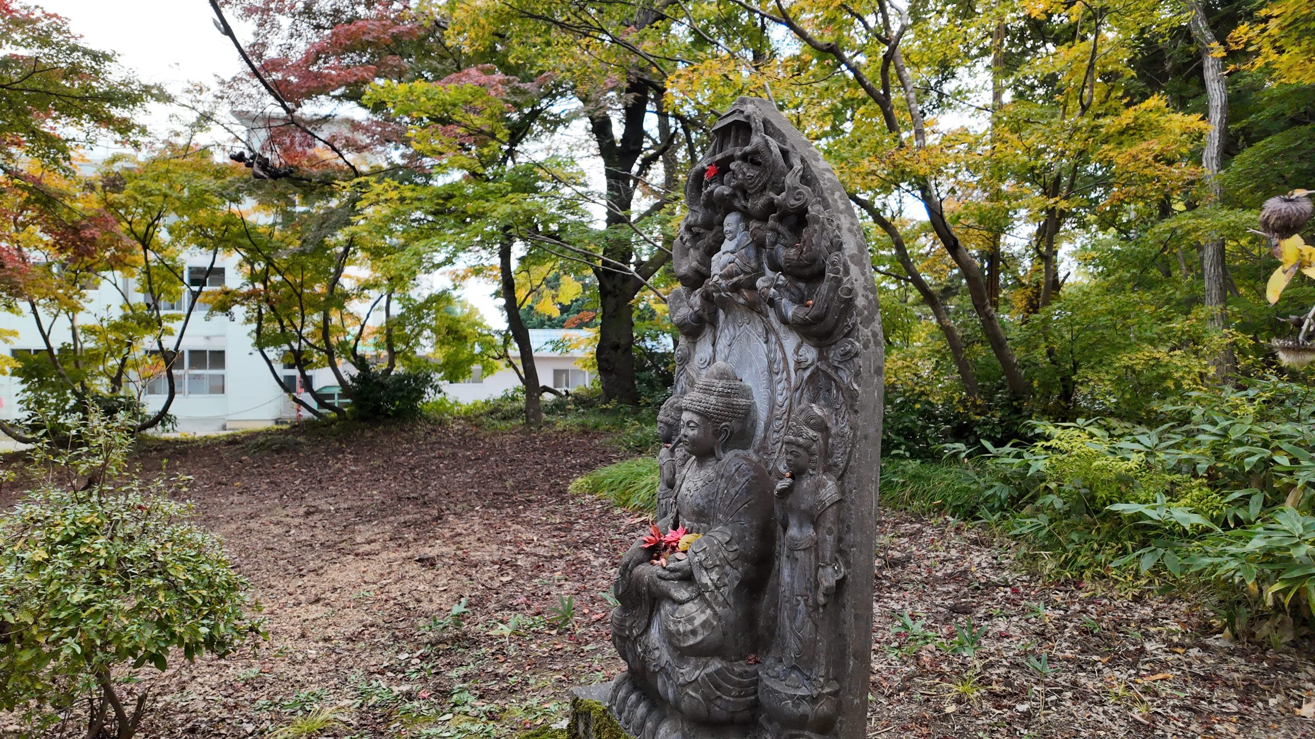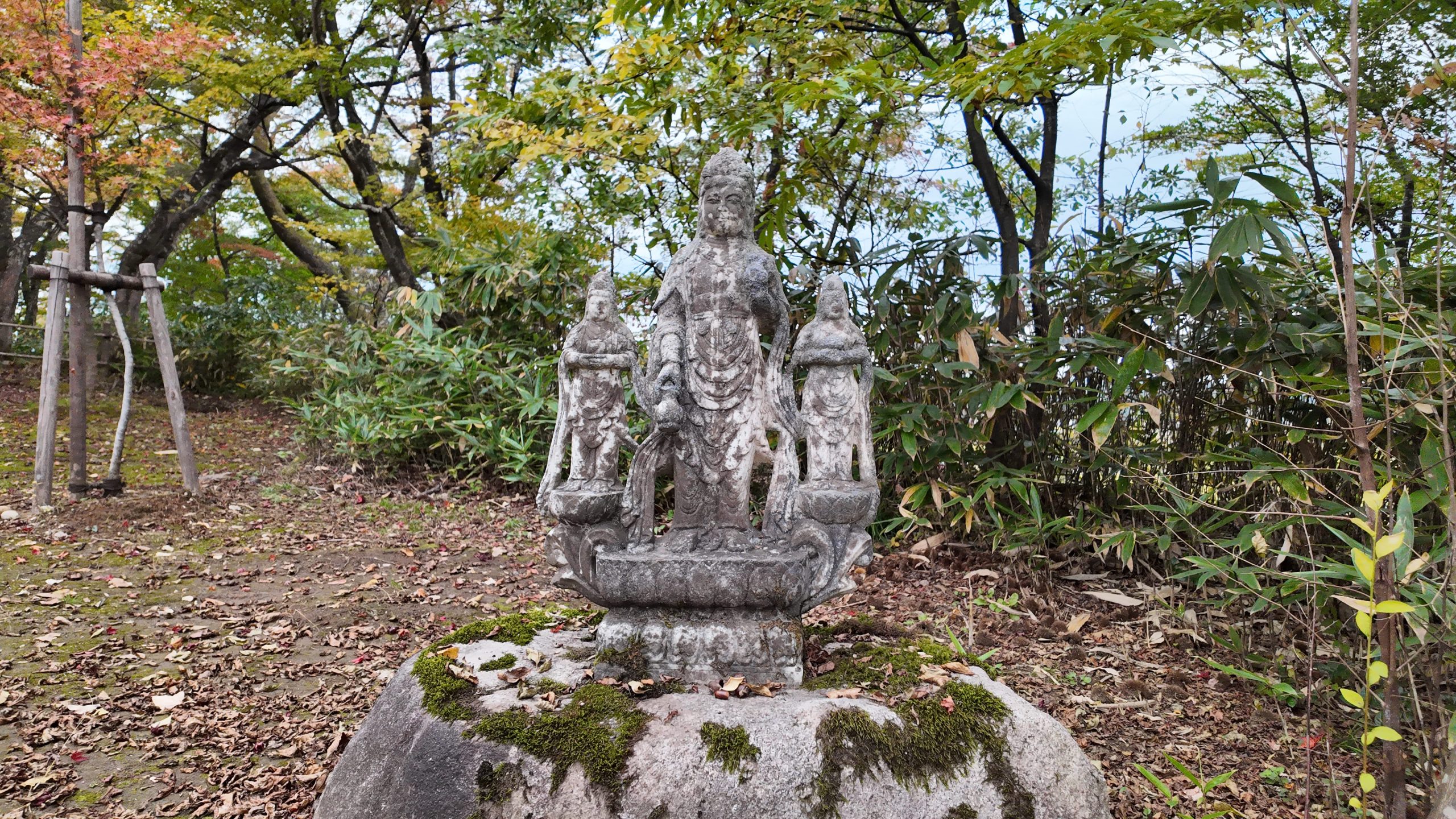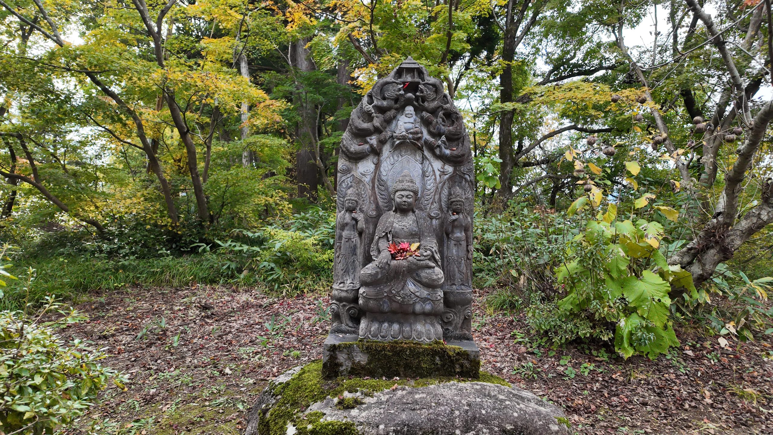 一部の像にはお供え物のようにドングリやモミジが置かれていました。