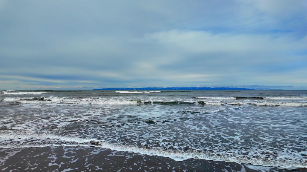 写真の一部には佐渡島さどがしま、さどしまが写っていますね。