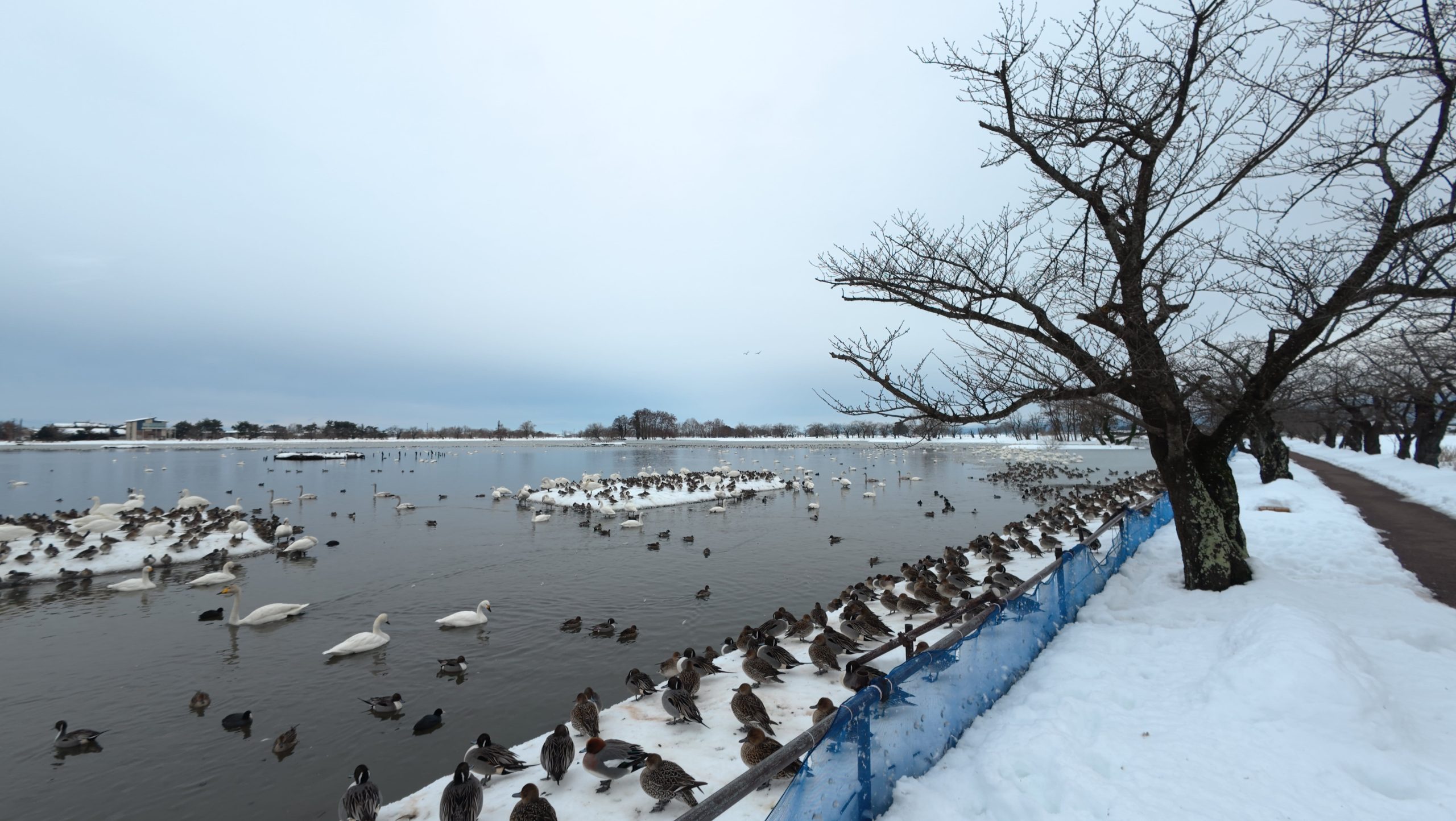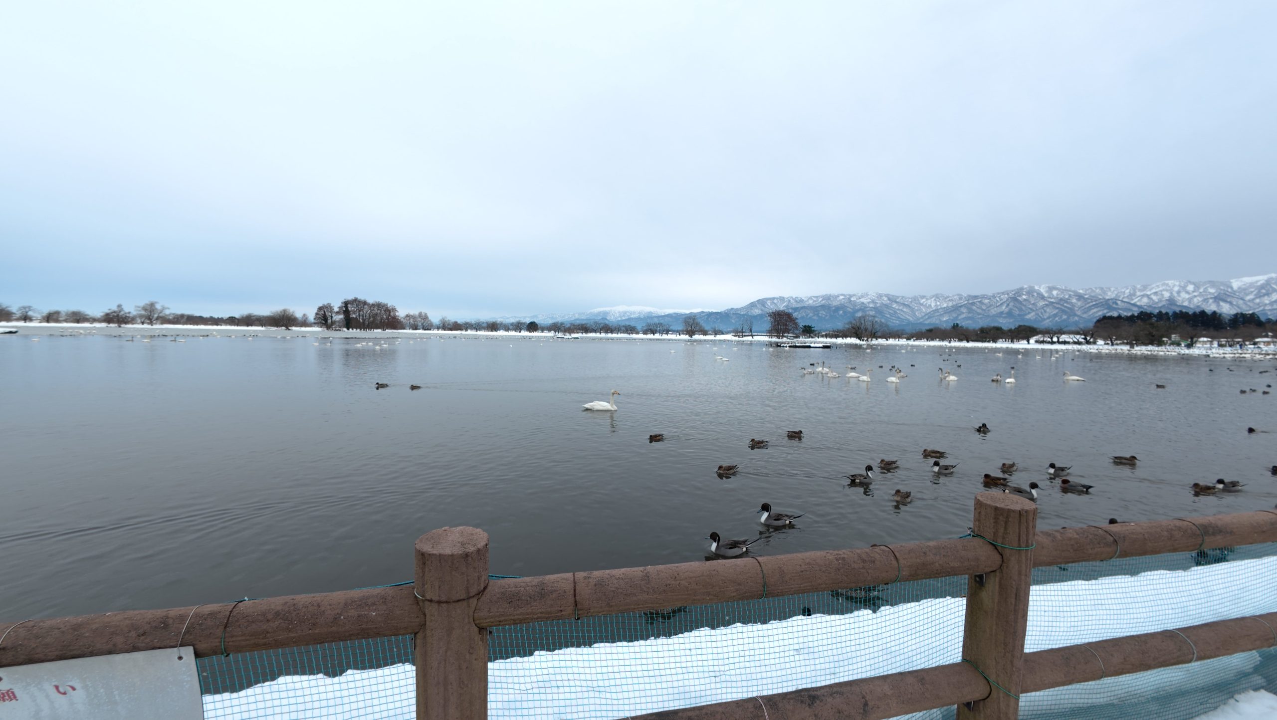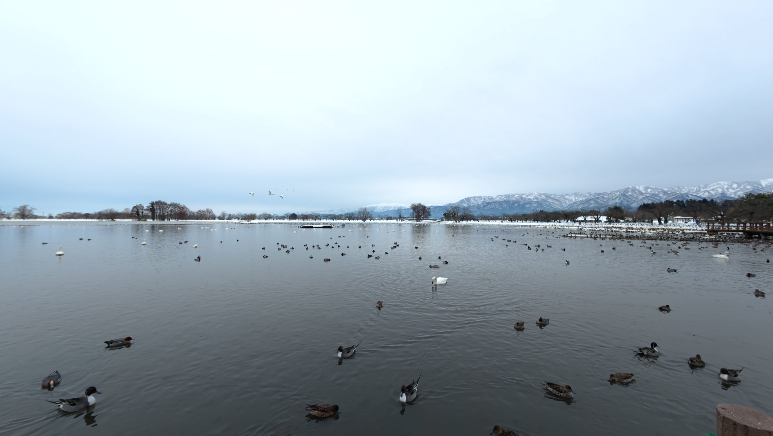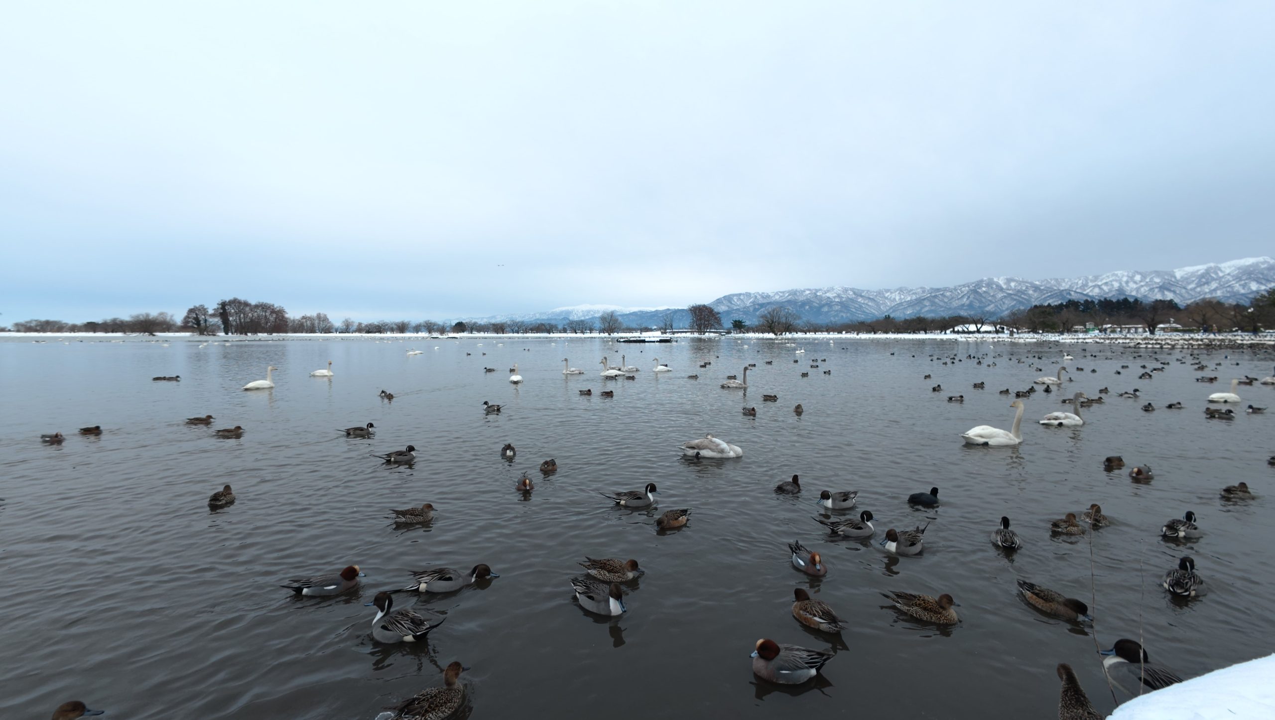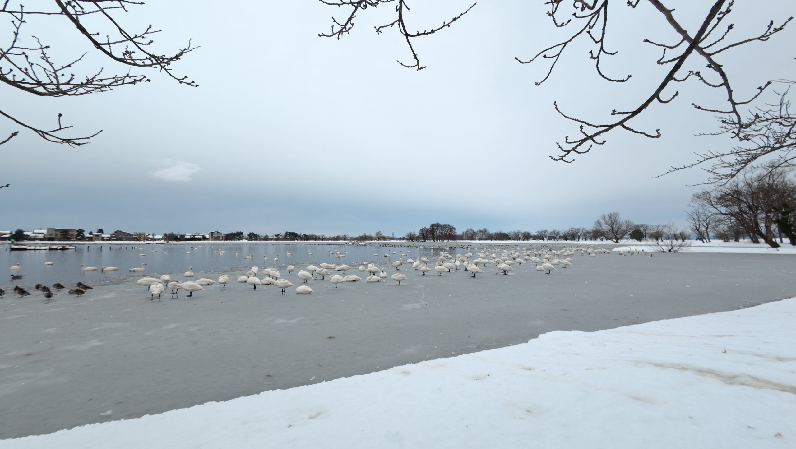 以下は瓢湖の水鳥たち。木々の葉は落ち、積雪もあり、ザ・冬の趣ですね。