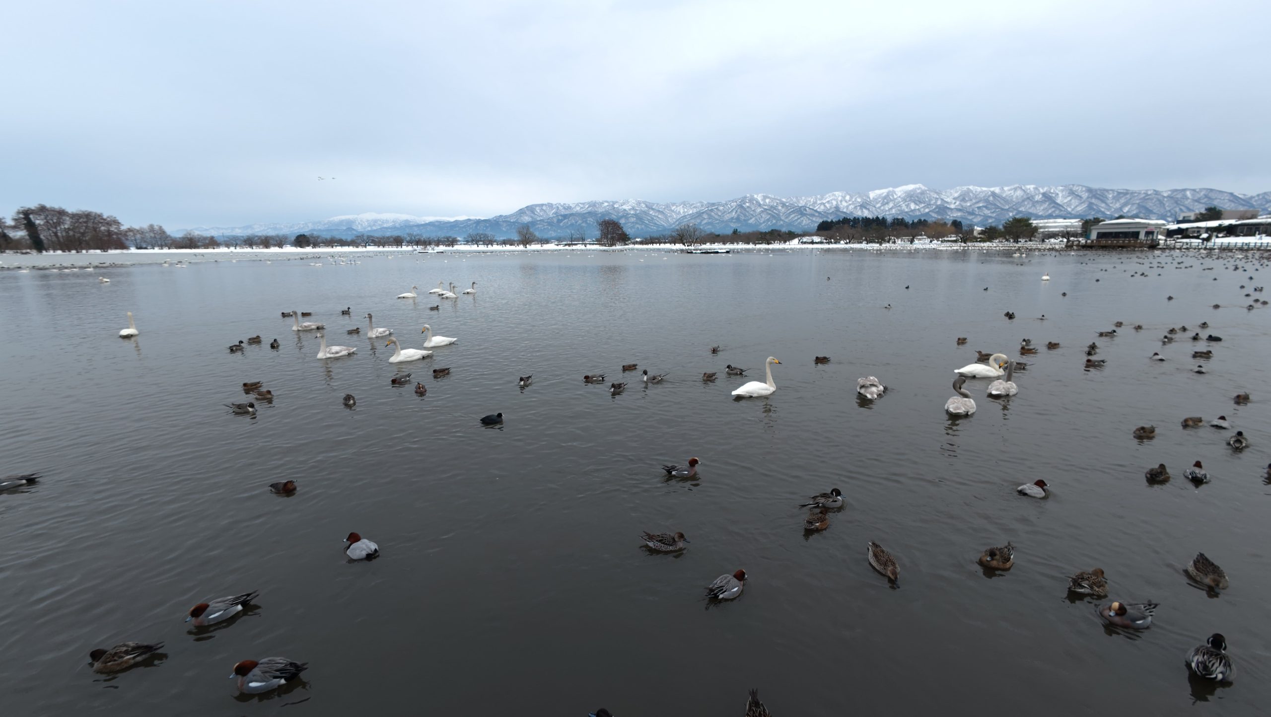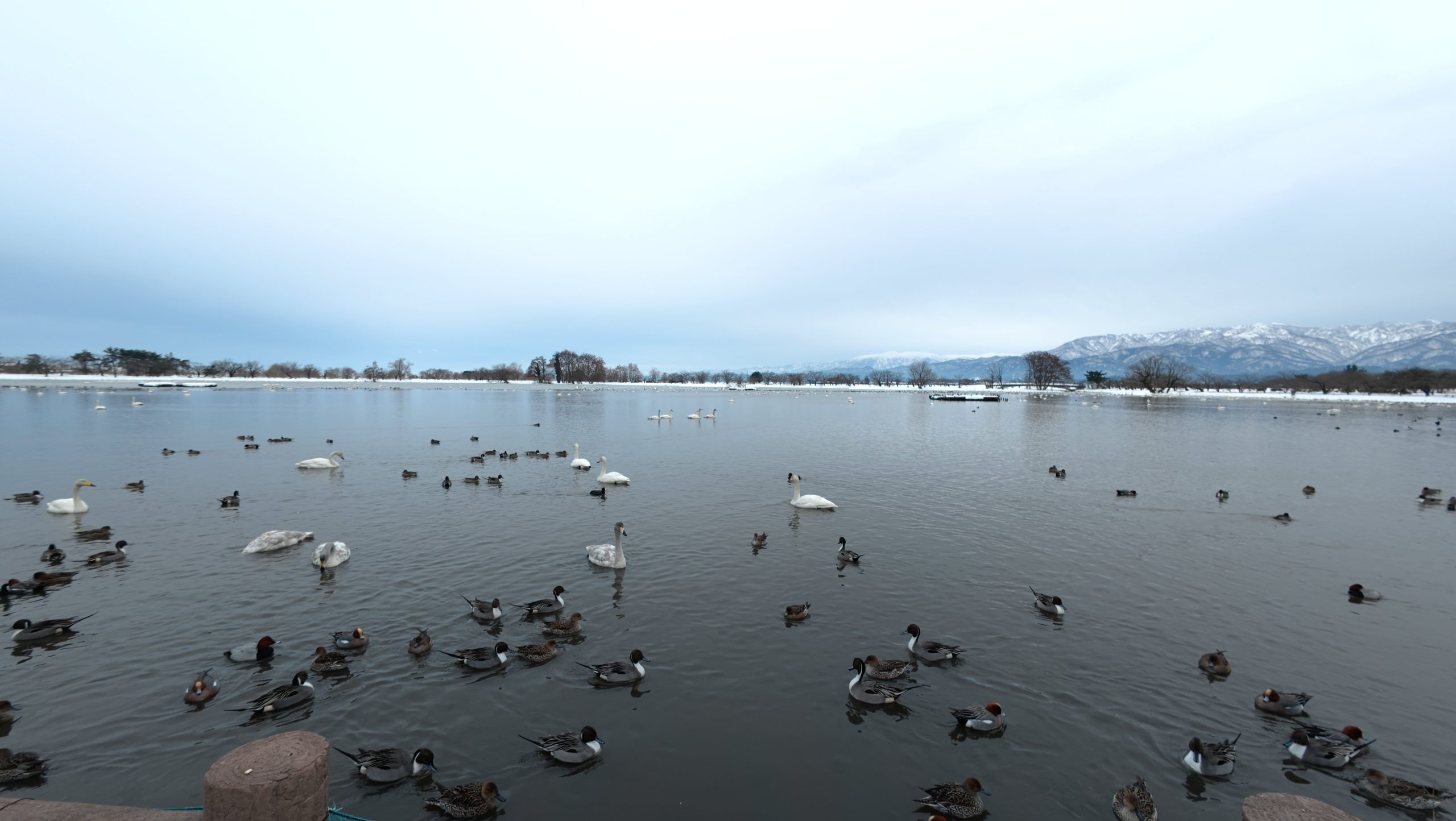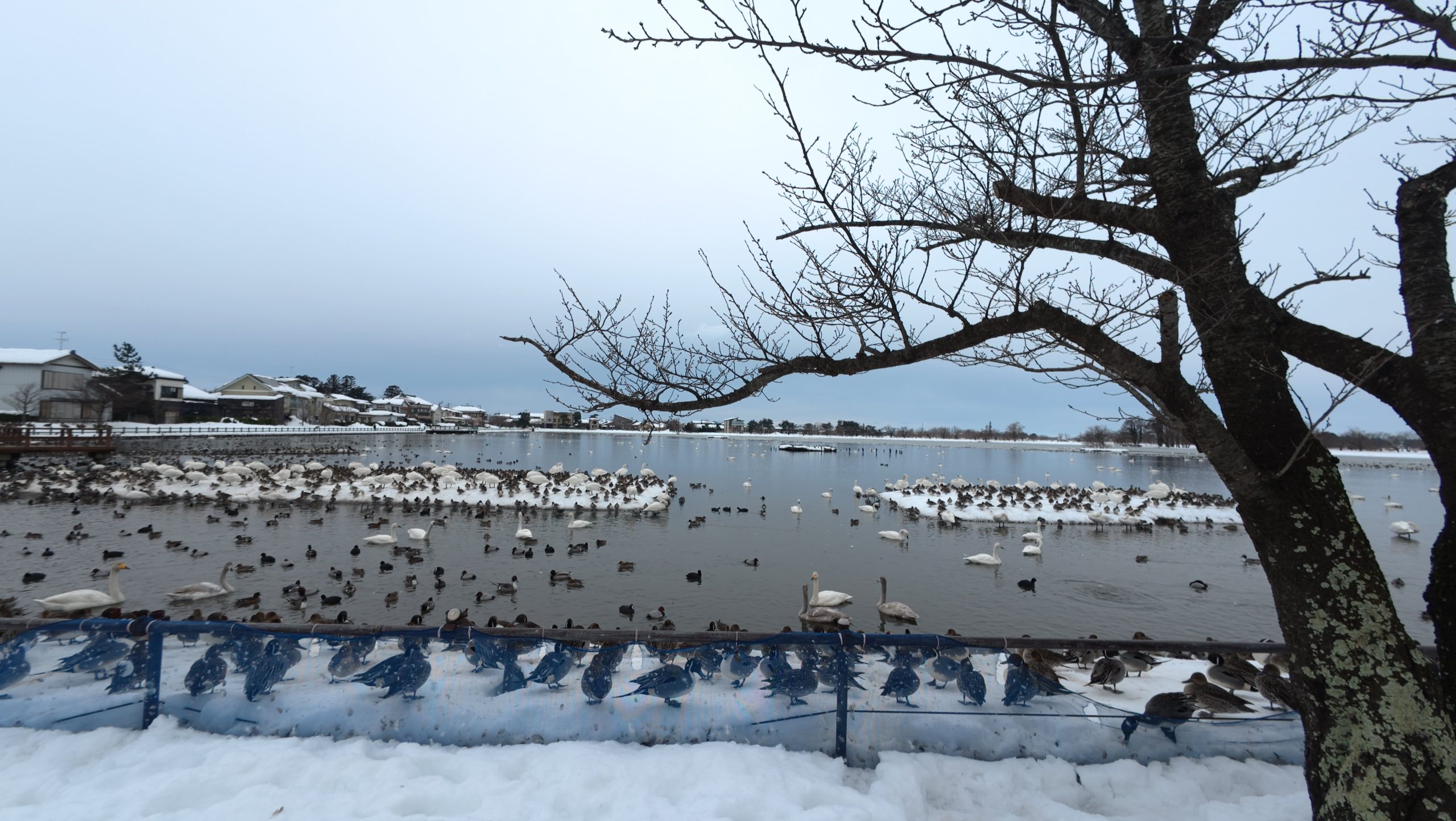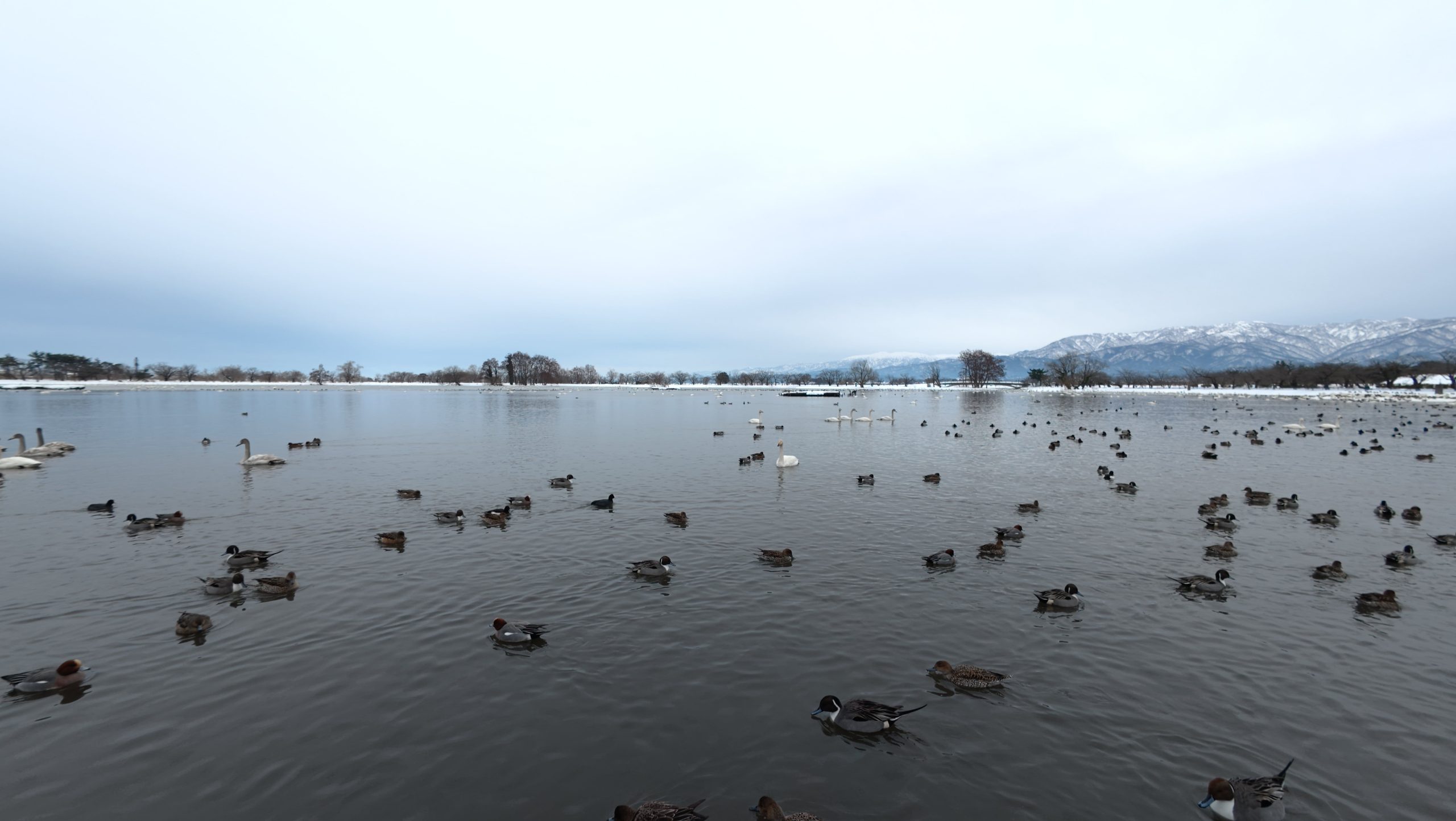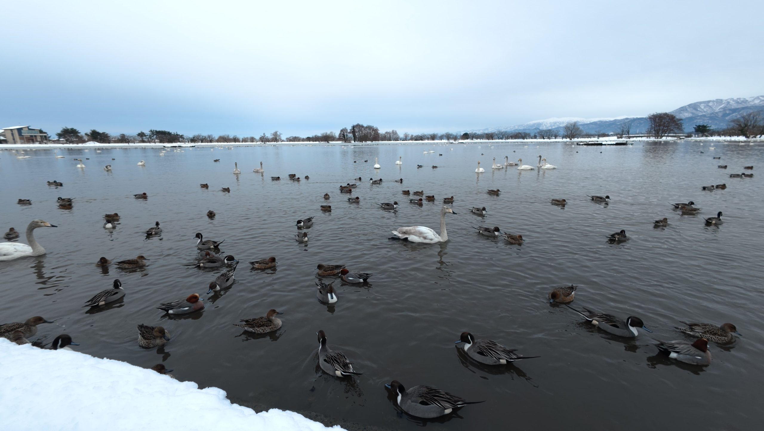 以下は瓢湖の水鳥たち。木々の葉は落ち、積雪もあり、ザ・冬の趣ですね。