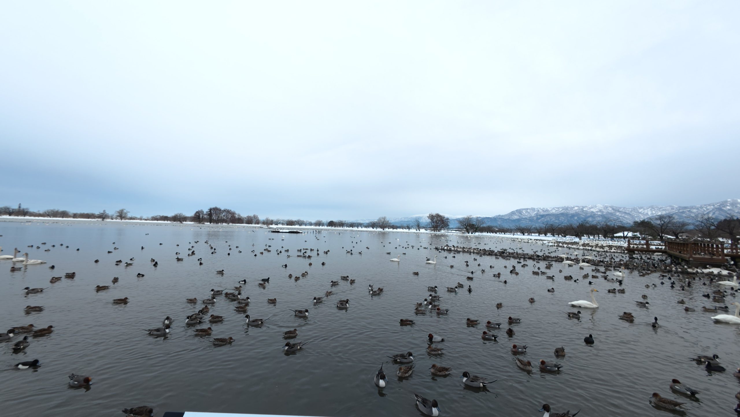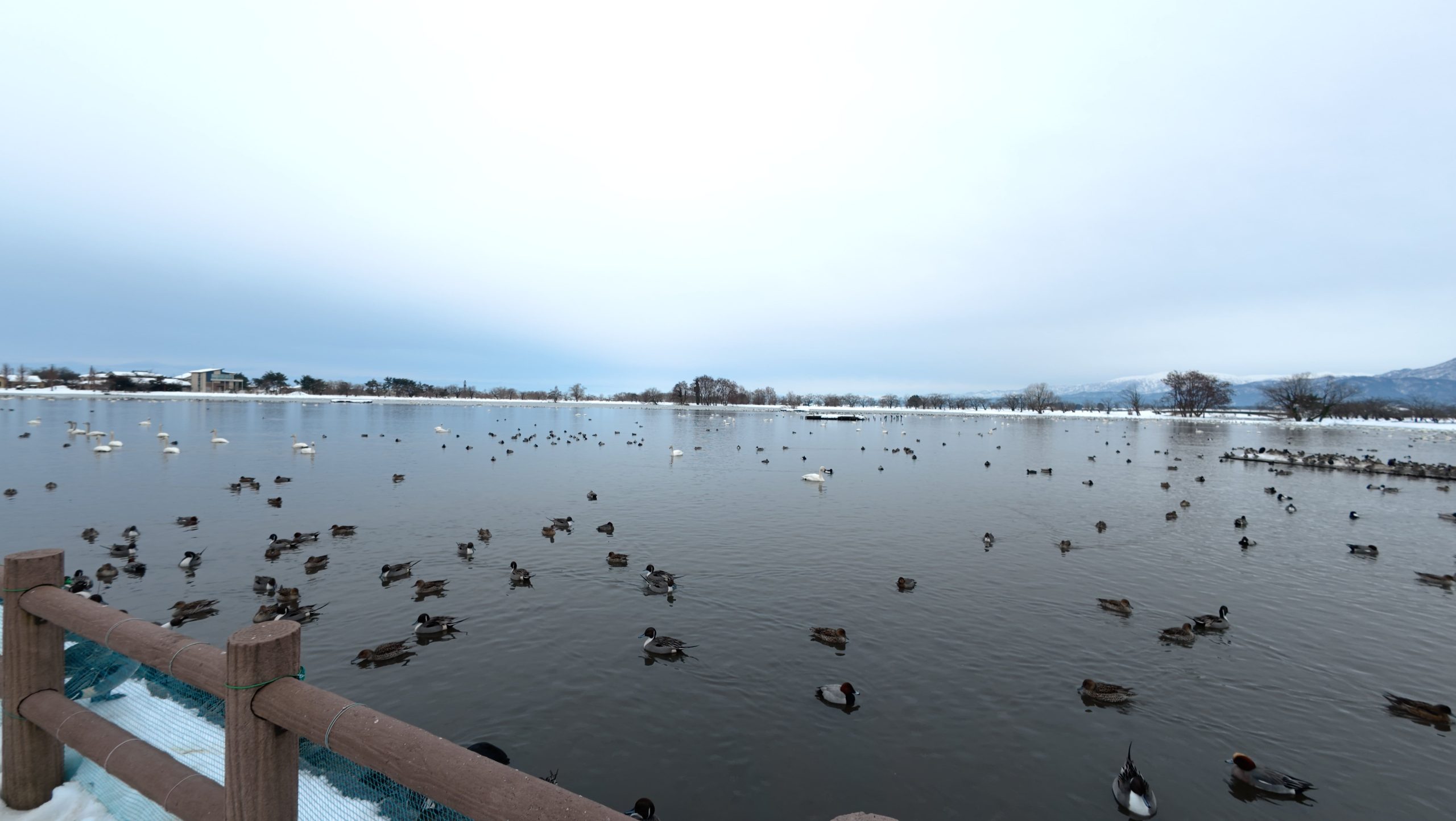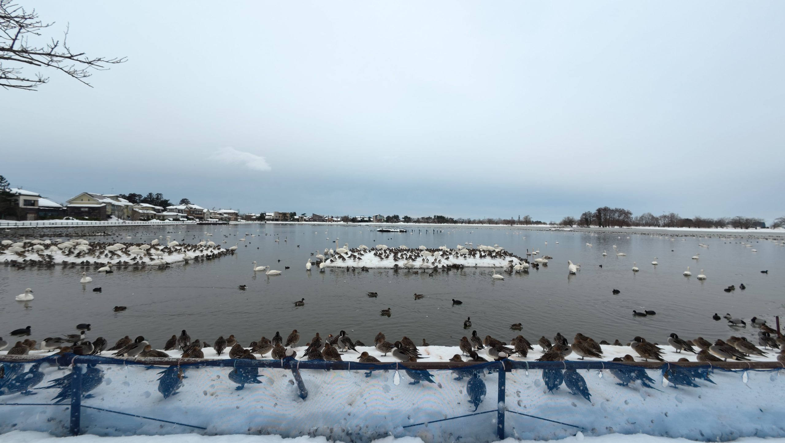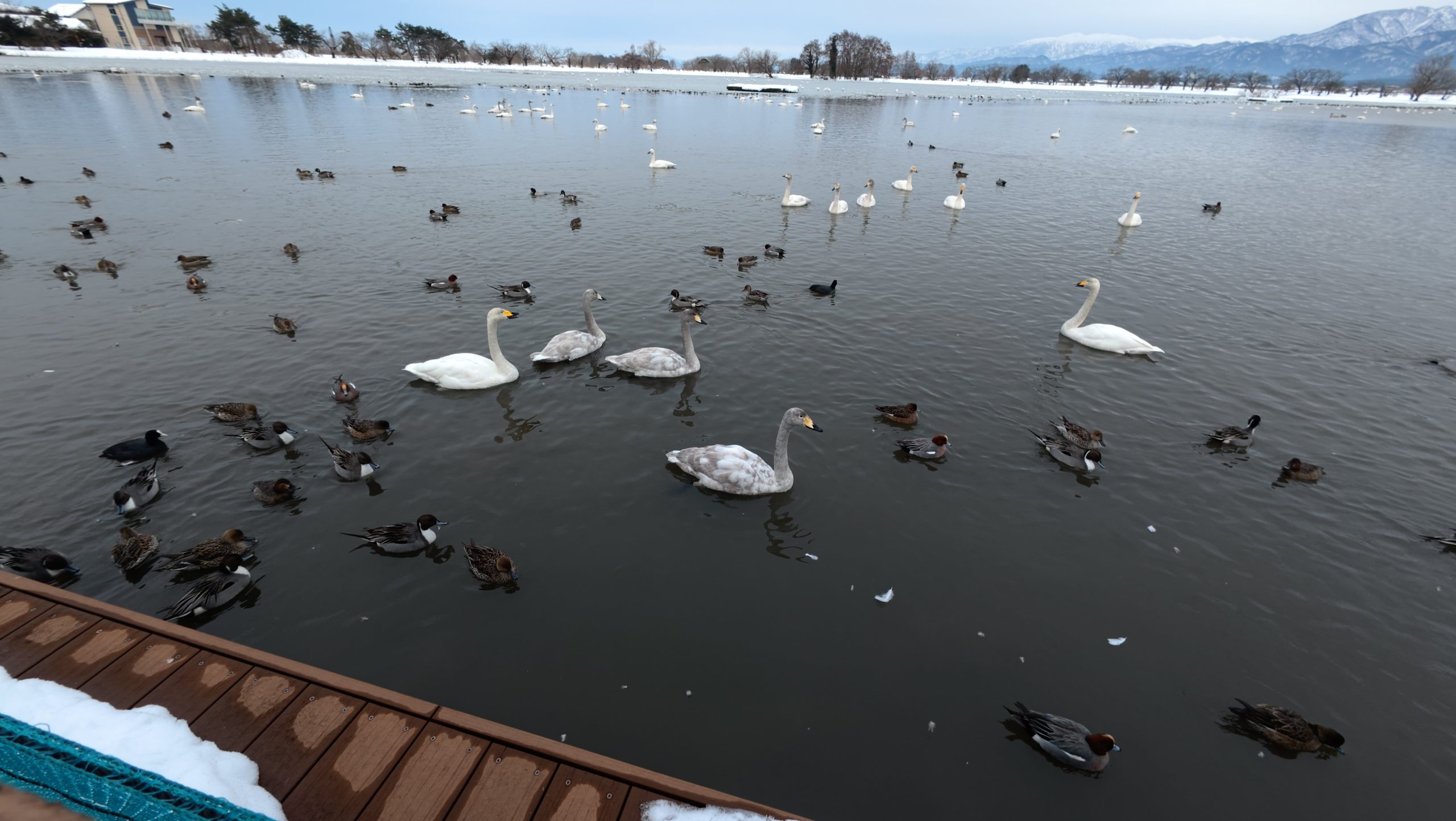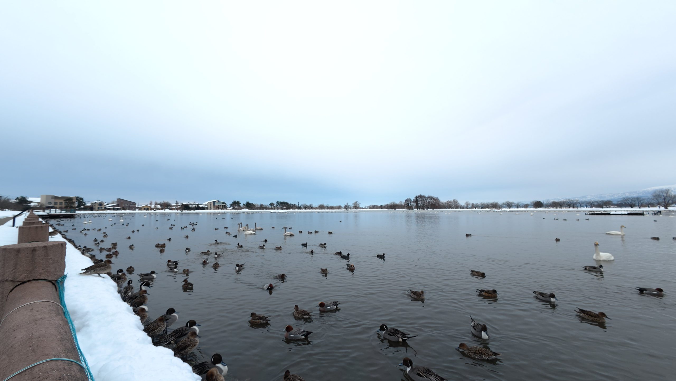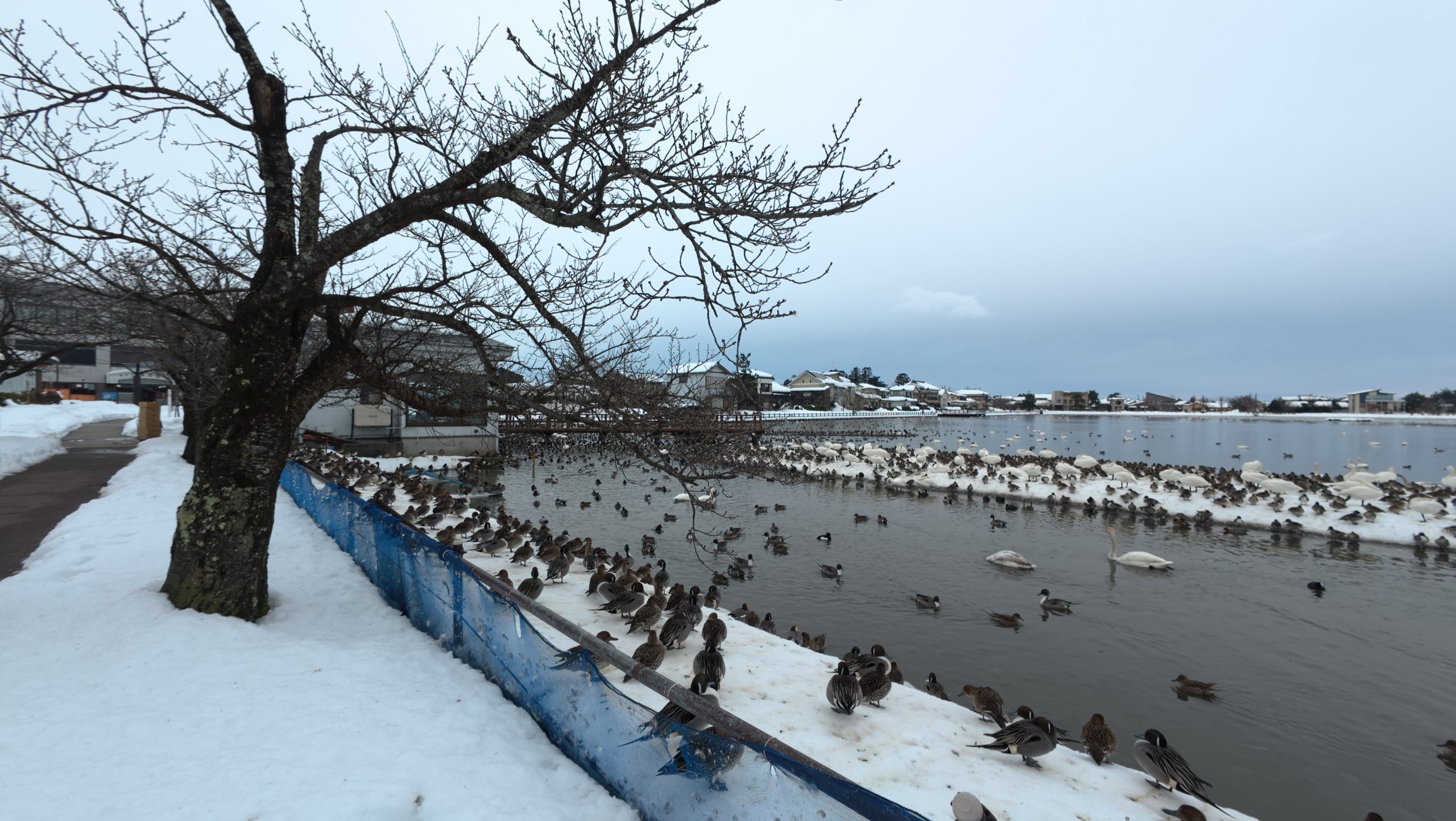 以下は瓢湖の水鳥たち。木々の葉は落ち、積雪もあり、ザ・冬の趣ですね。