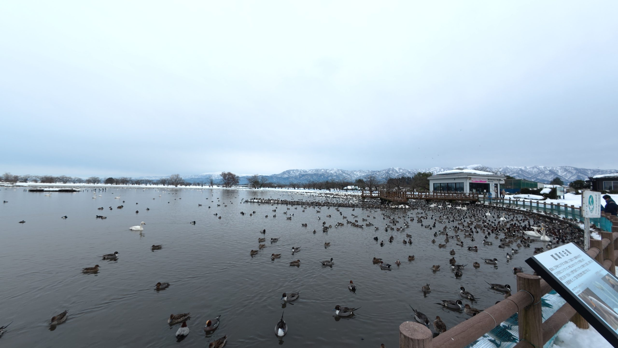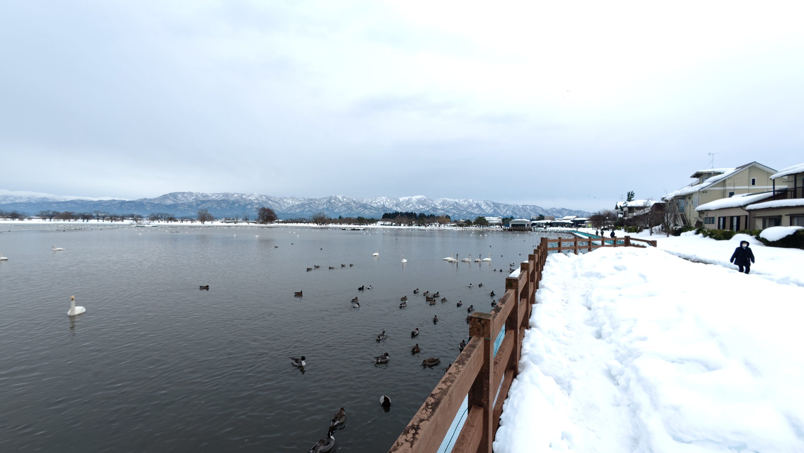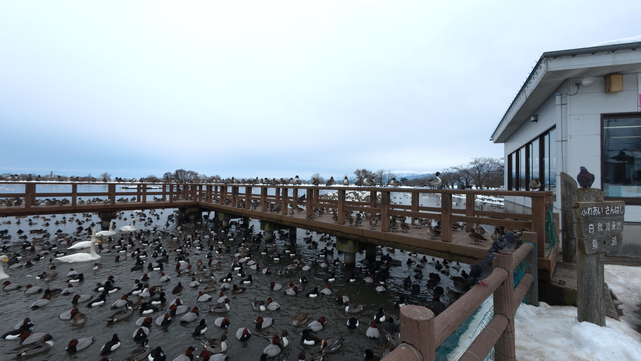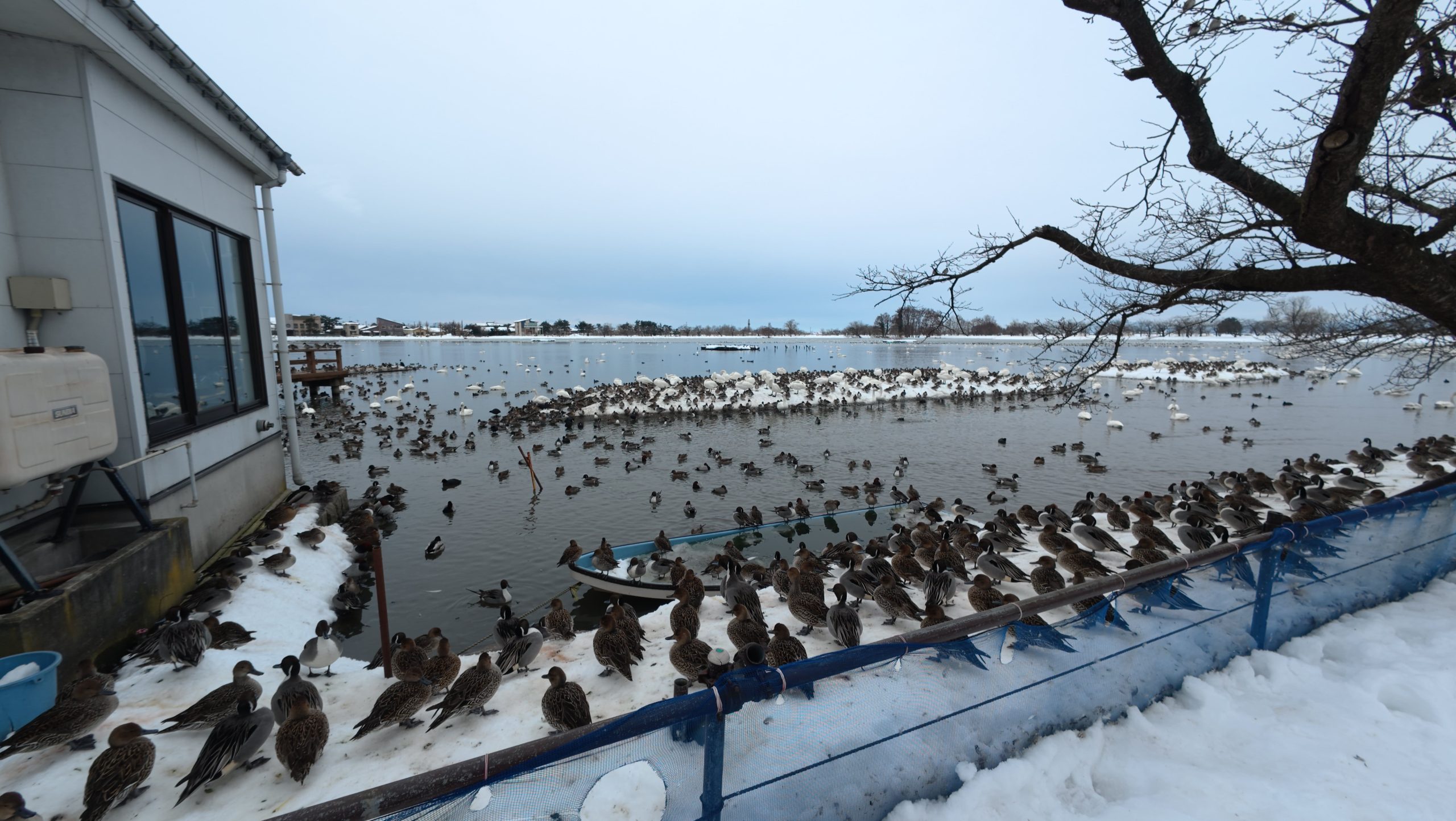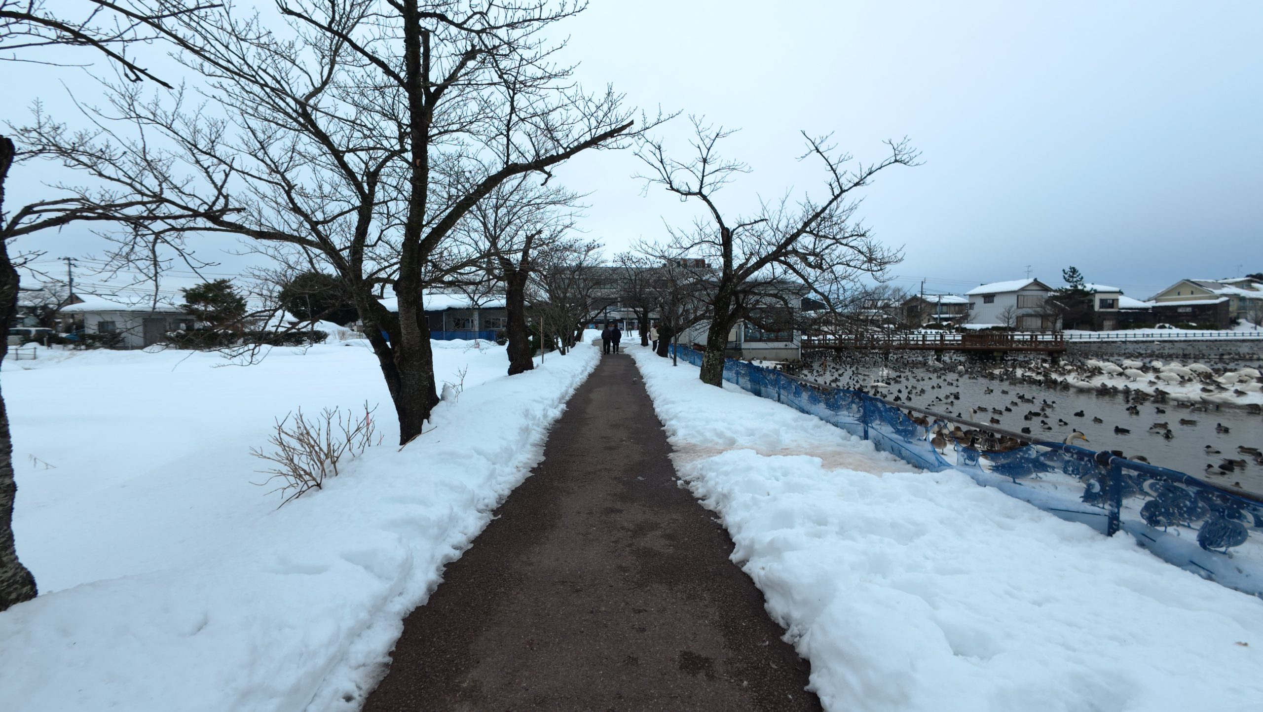 以下は瓢湖の水鳥たち。木々の葉は落ち、積雪もあり、ザ・冬の趣ですね。