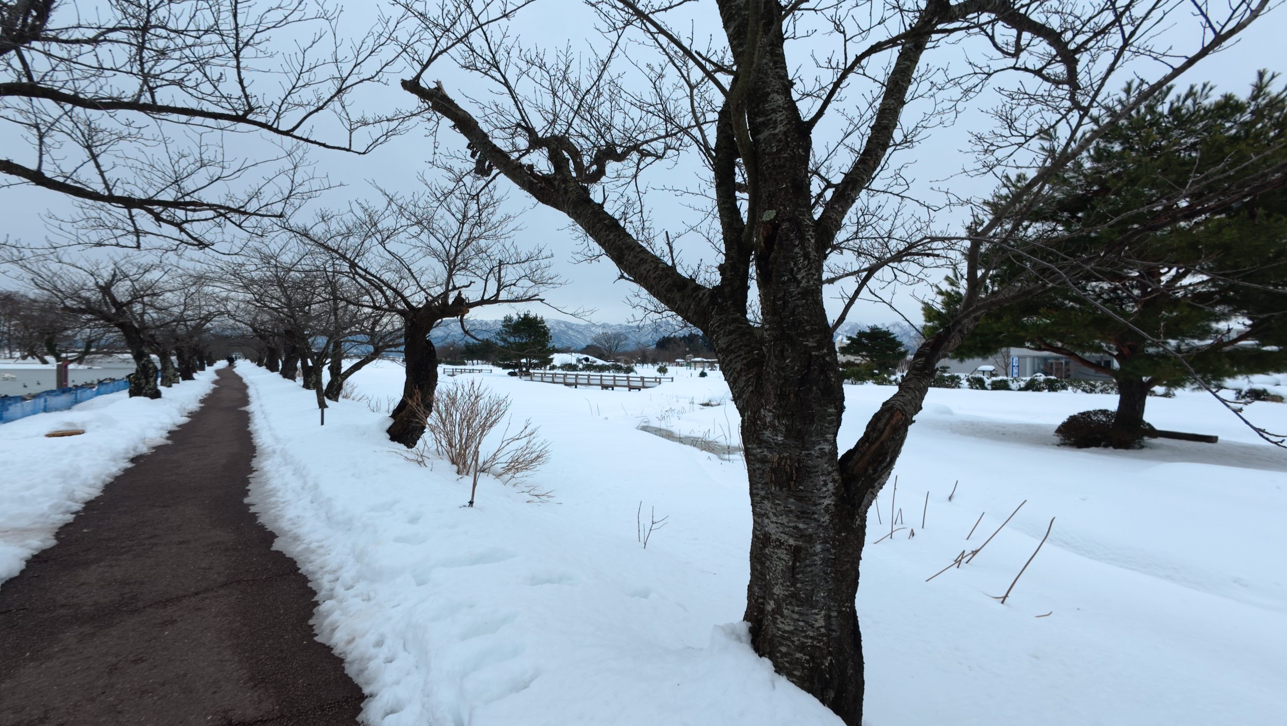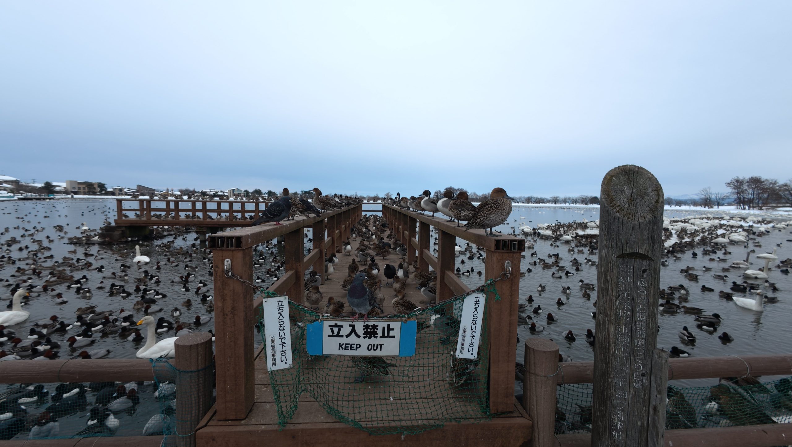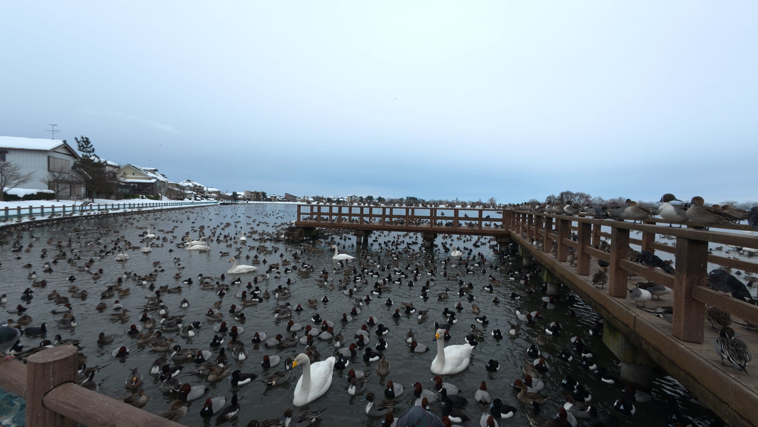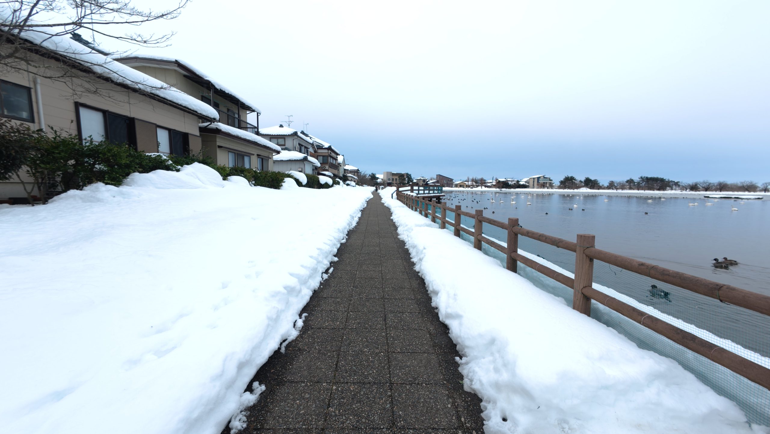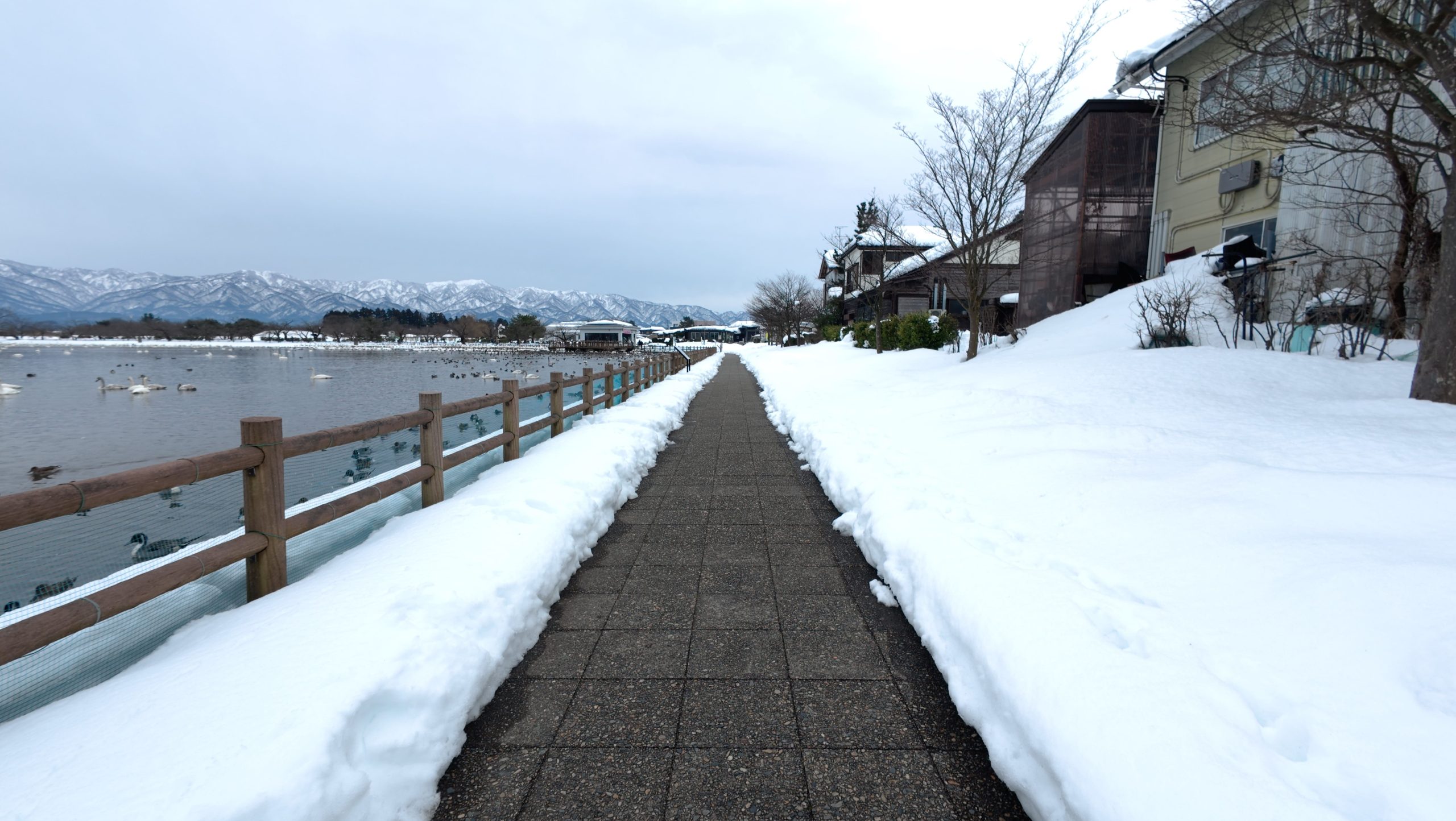 以下は瓢湖の水鳥たち。木々の葉は落ち、積雪もあり、ザ・冬の趣ですね。