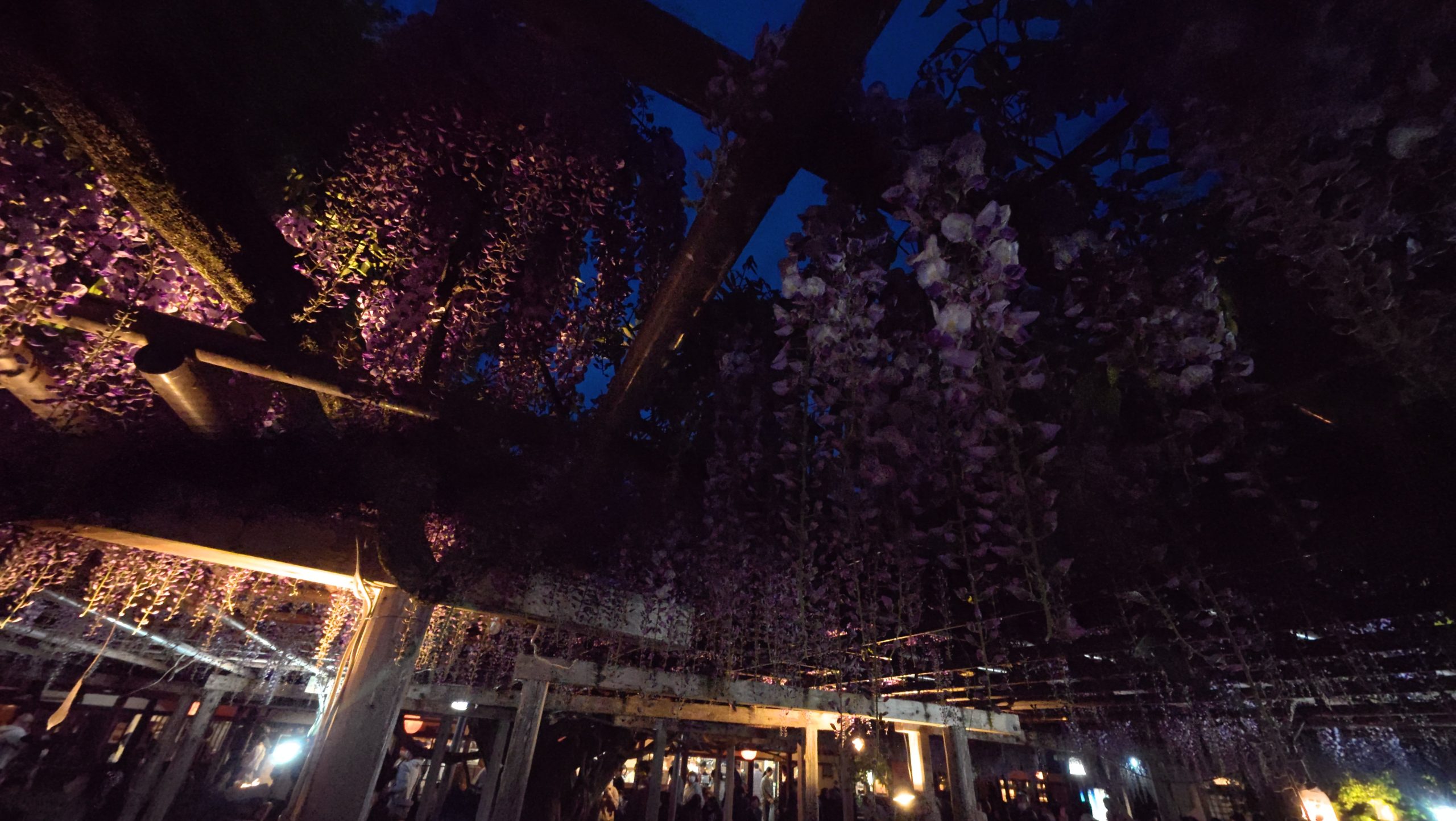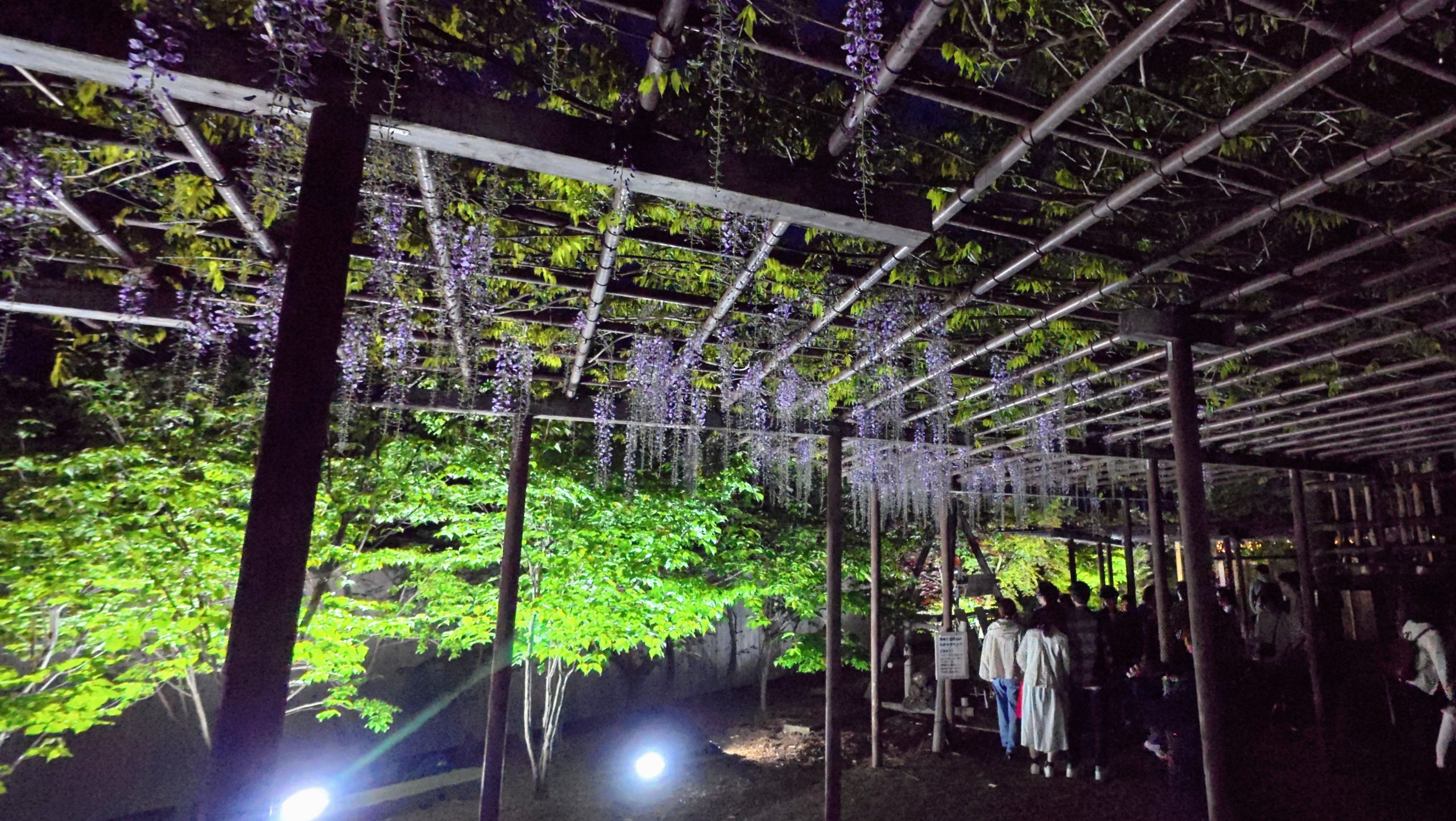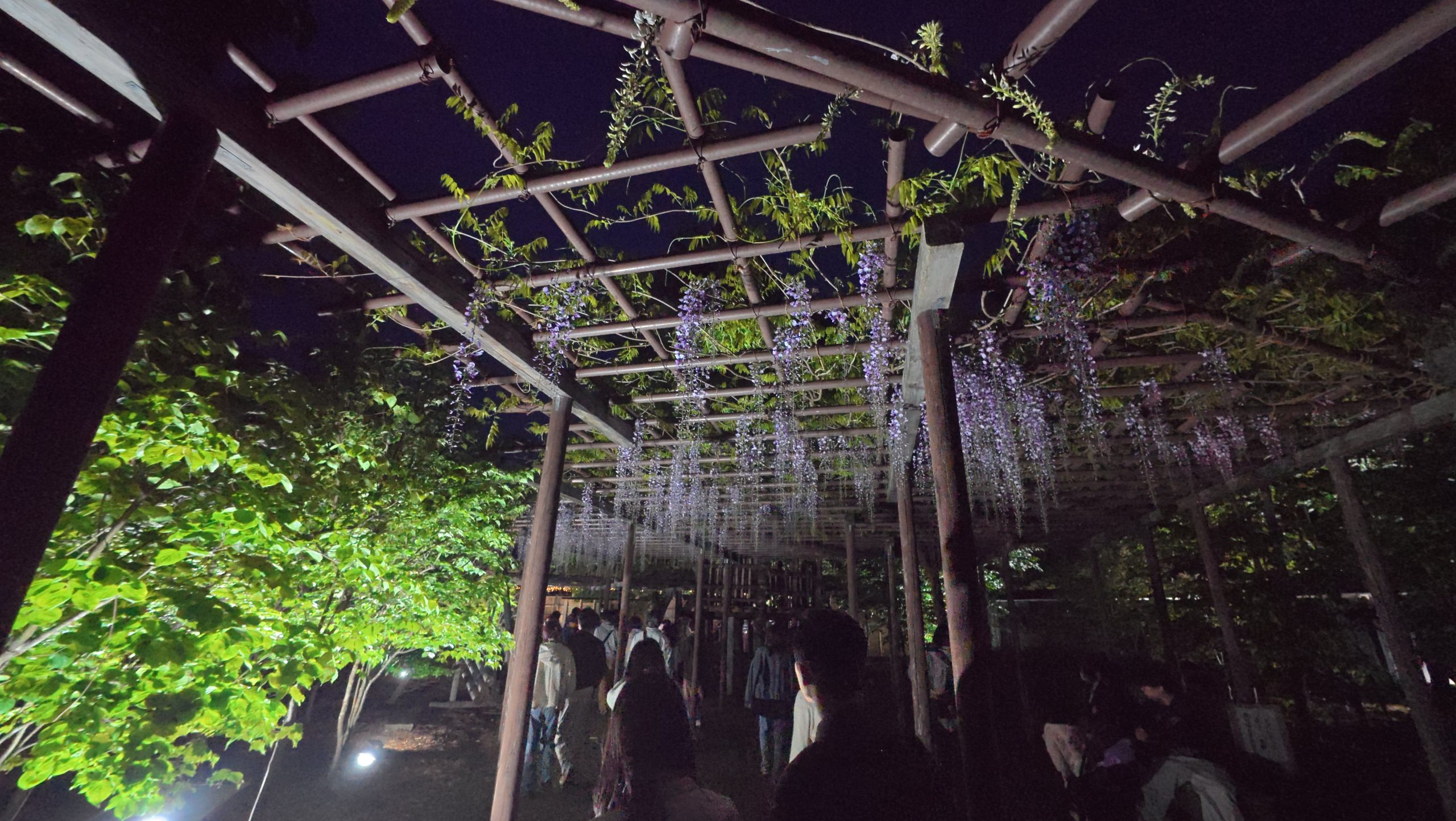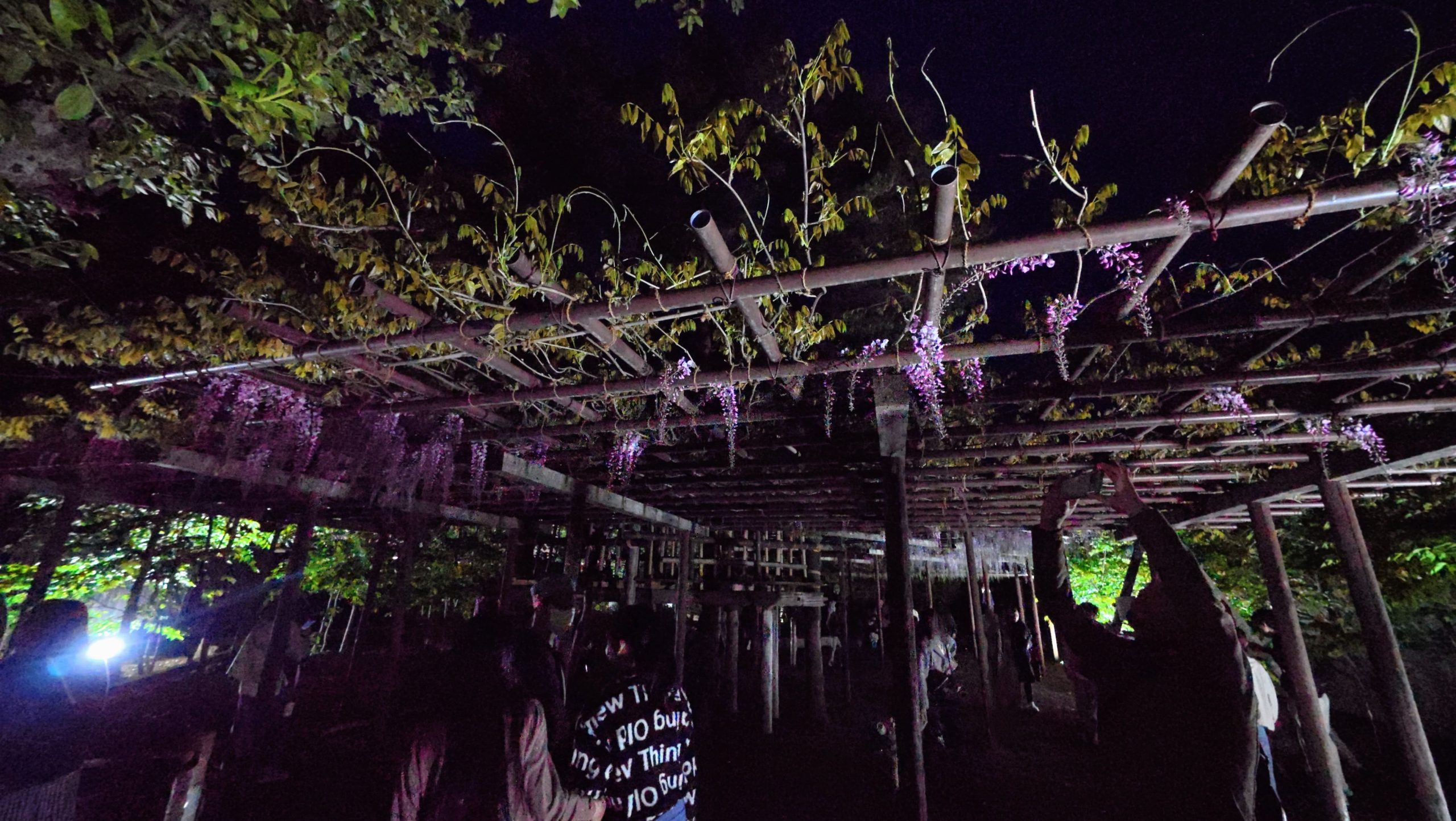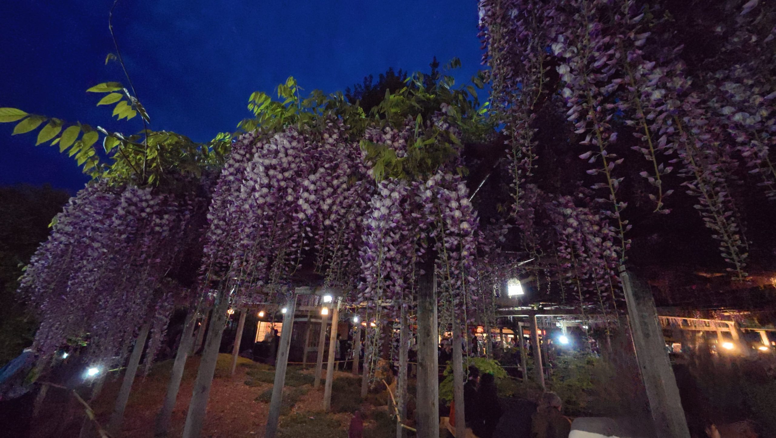 甘い香りを放っており、藤色の花はライトに照らされて幻想的でした。