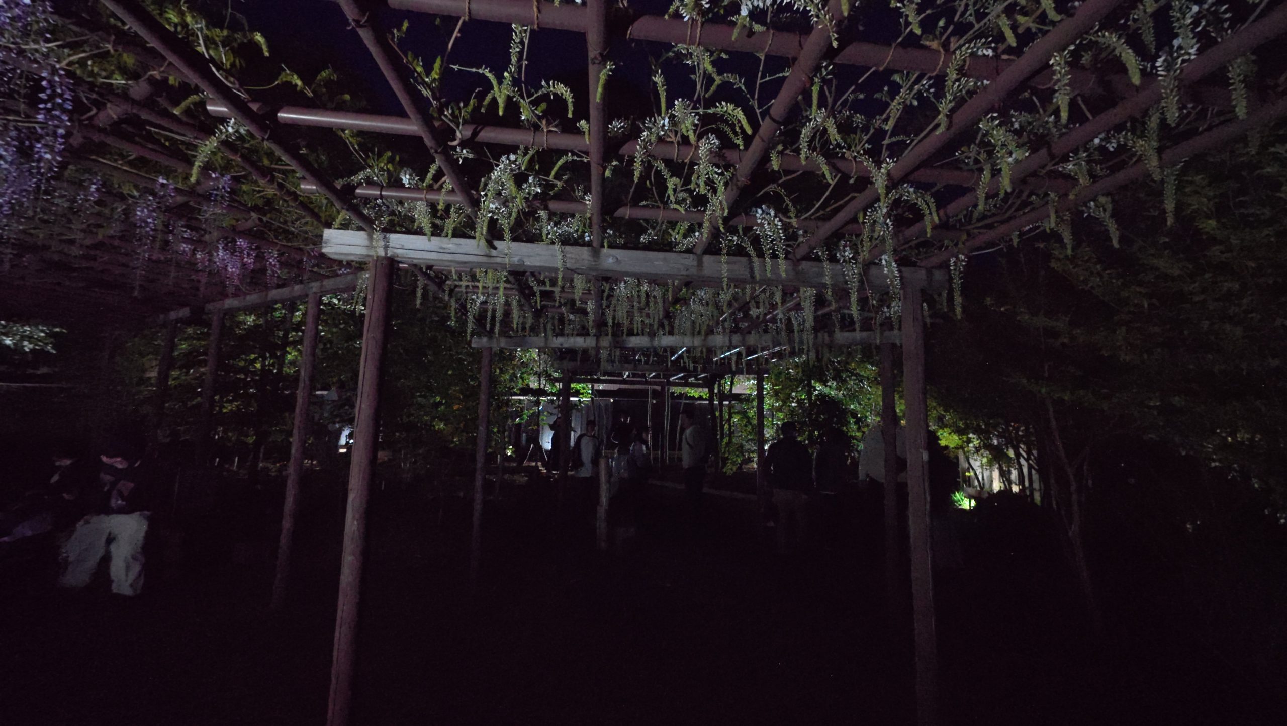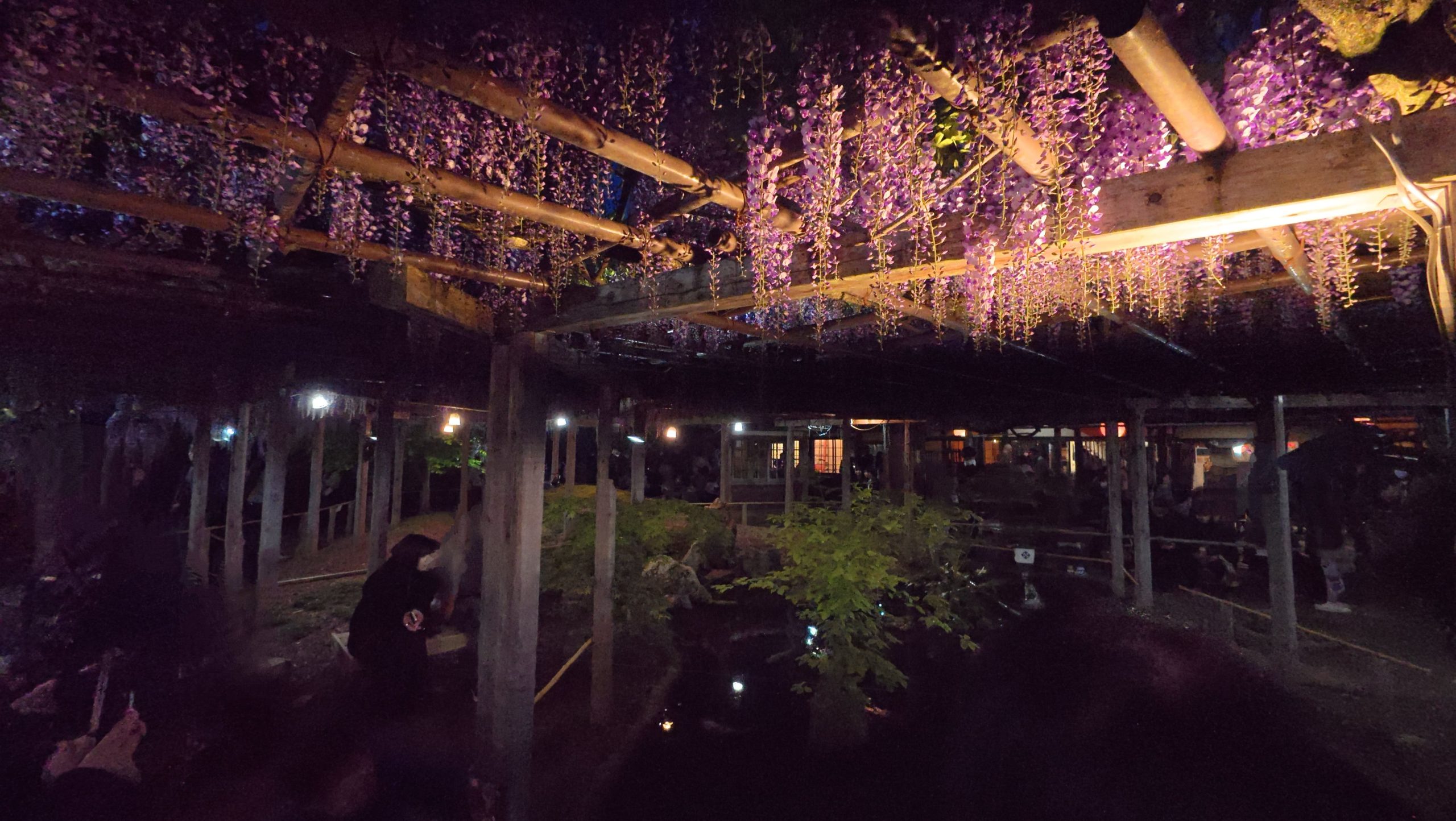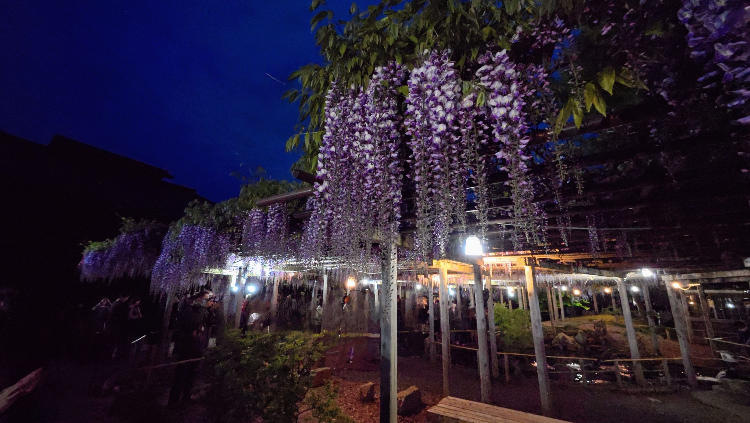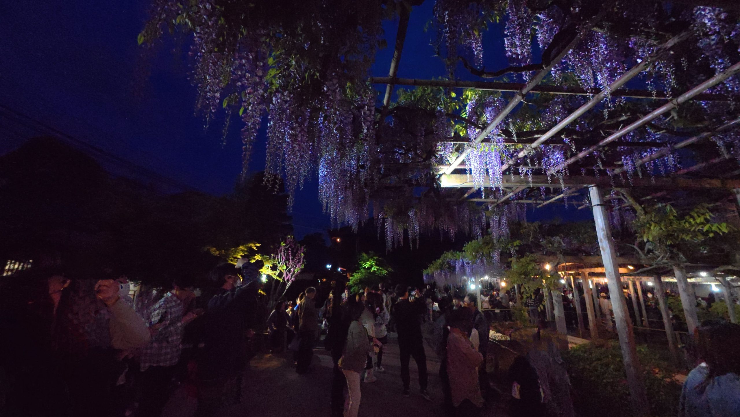 甘い香りを放っており、藤色の花はライトに照らされて幻想的でした。