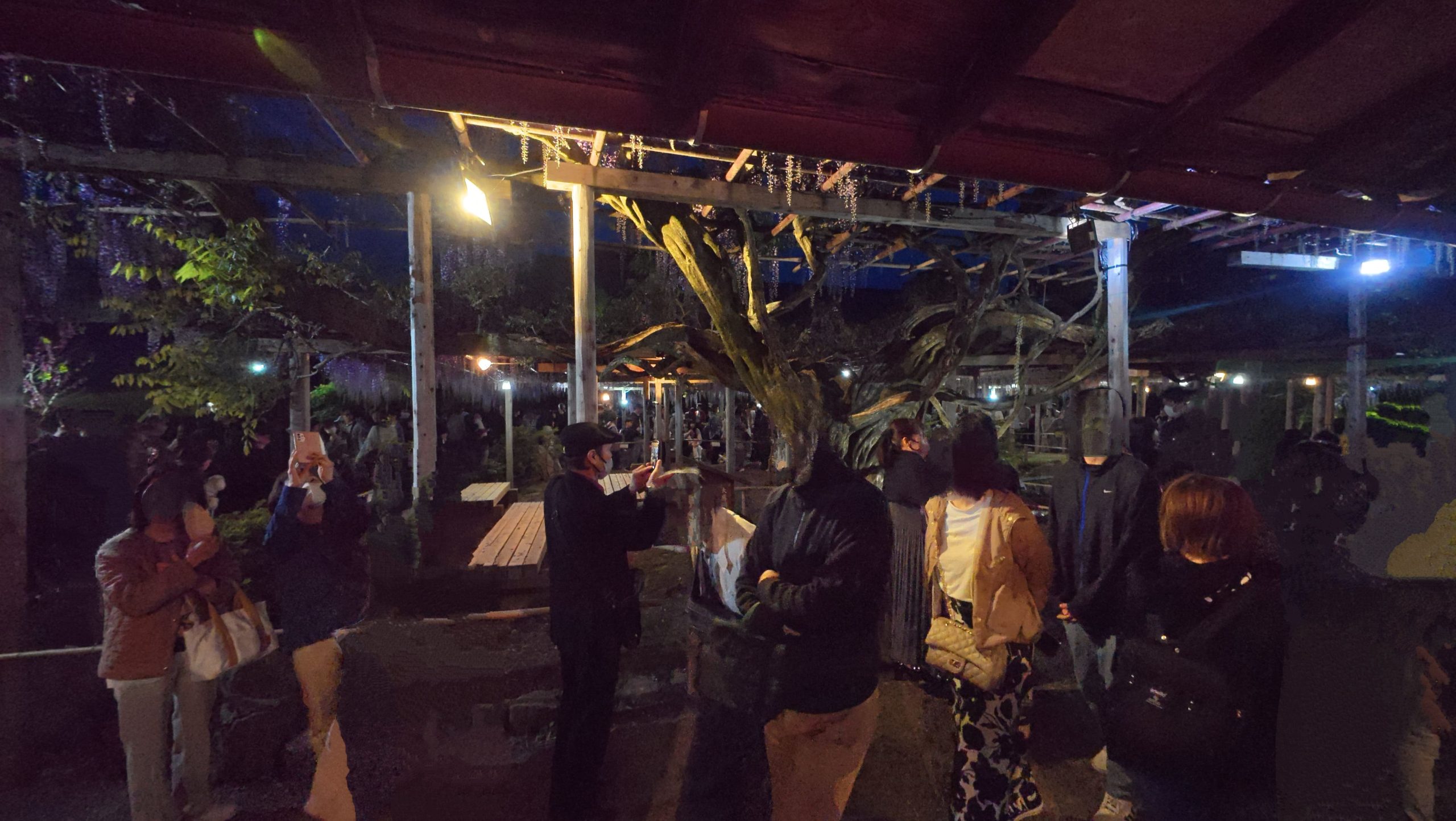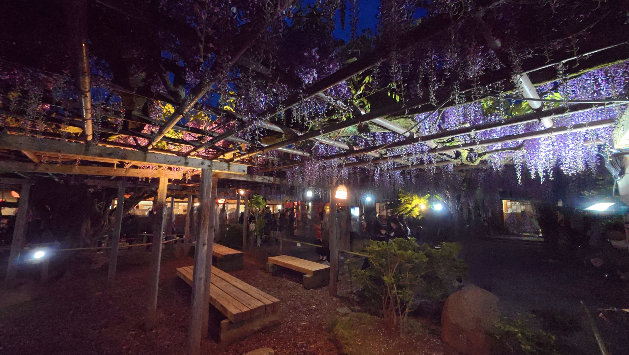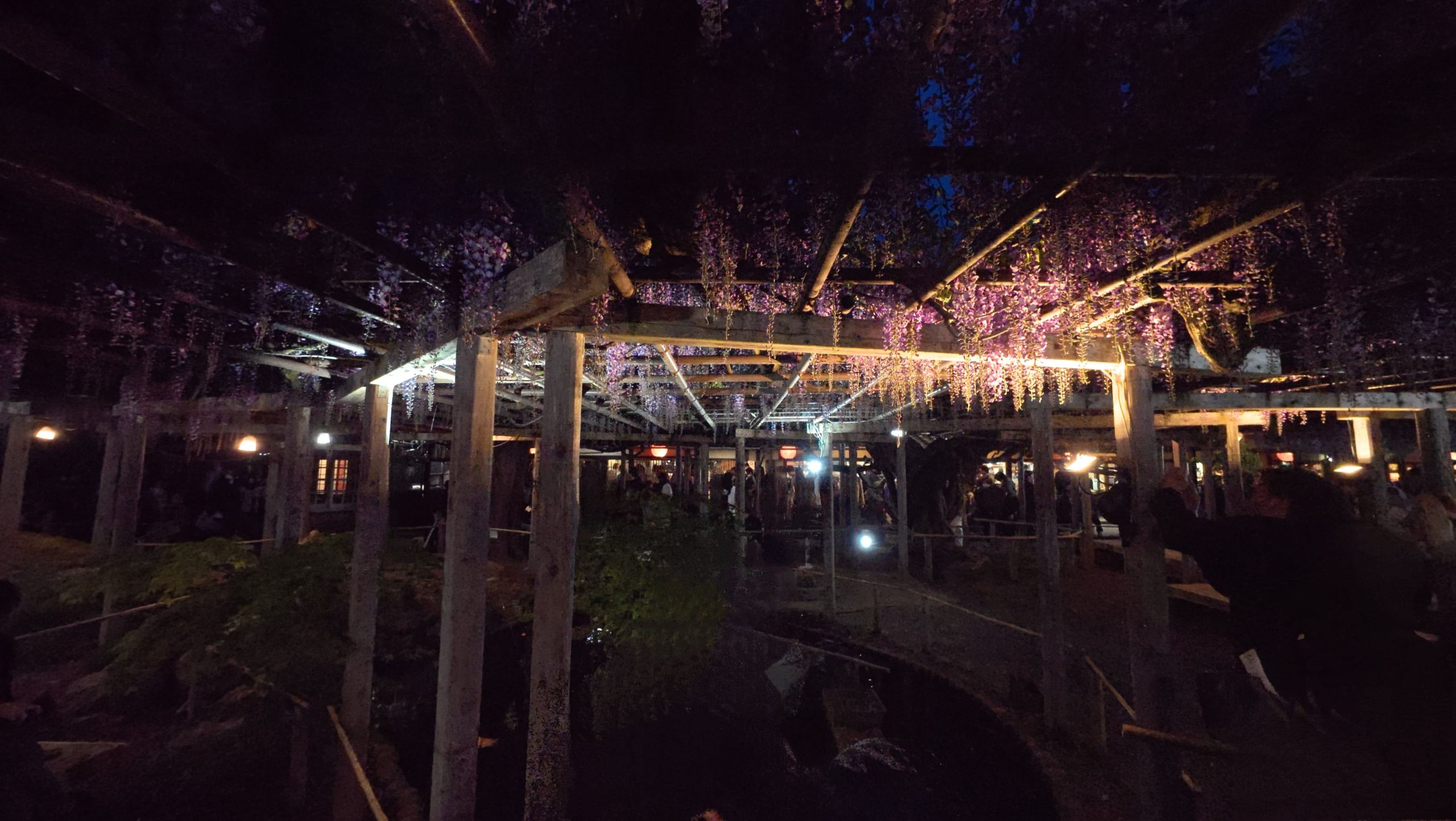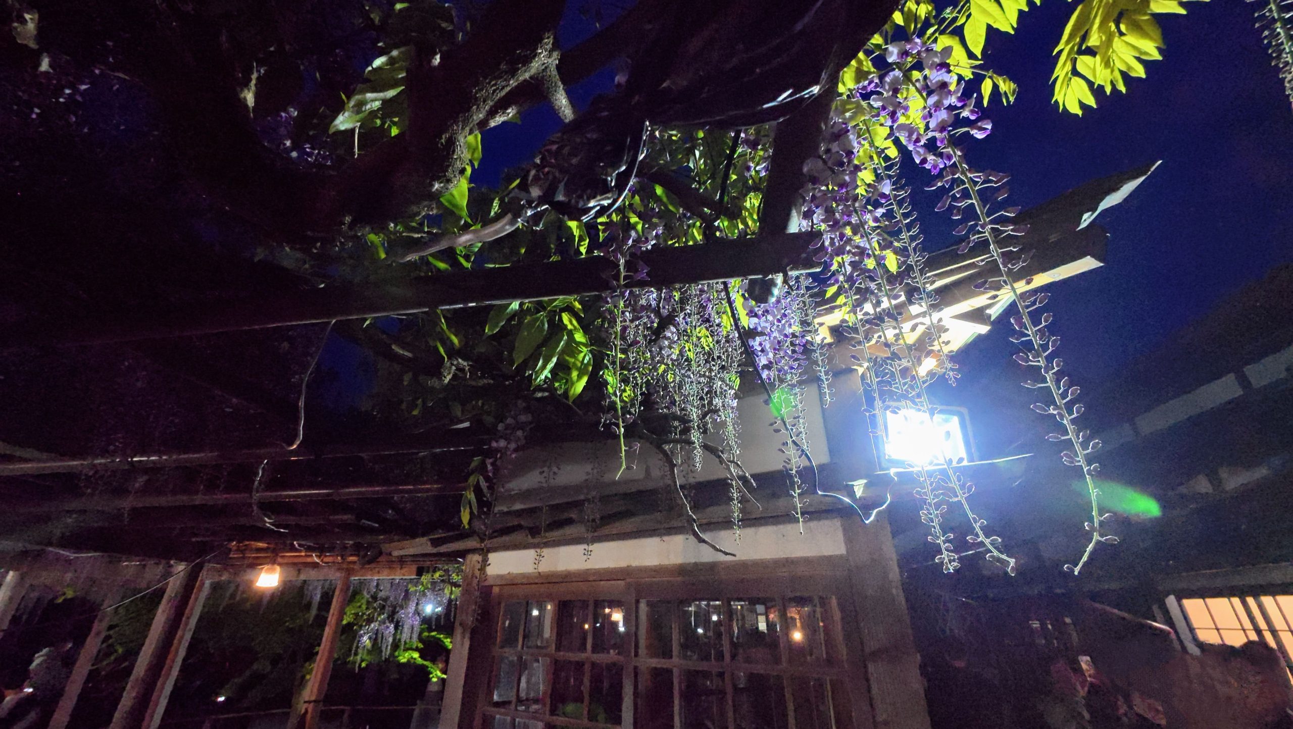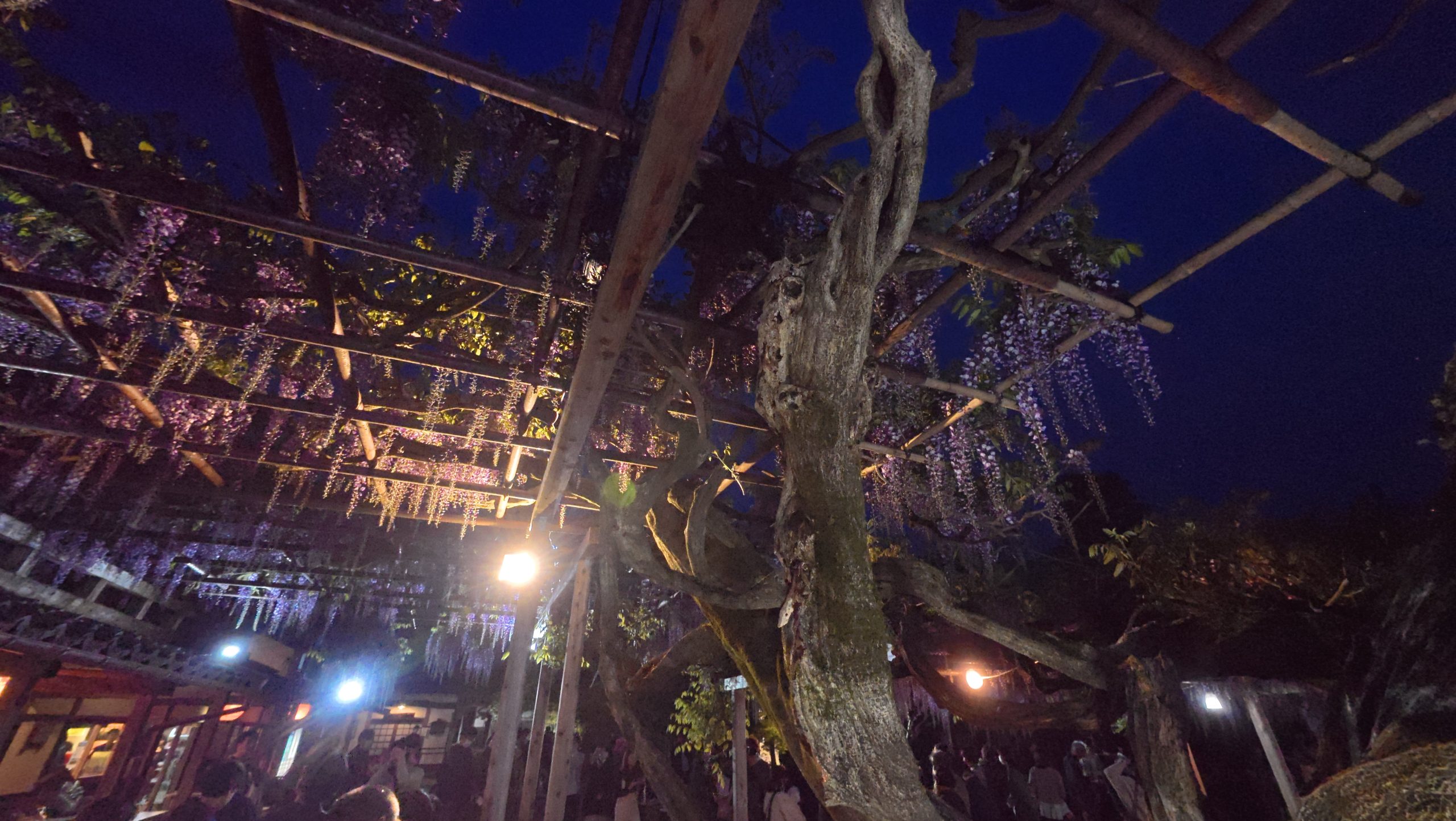 甘い香りを放っており、藤色の花はライトに照らされて幻想的でした。