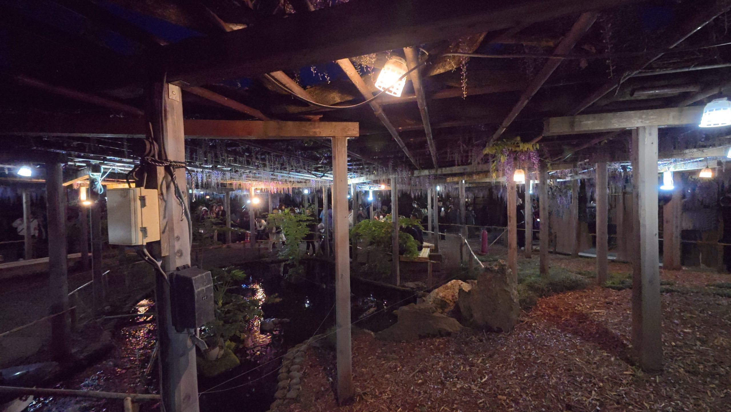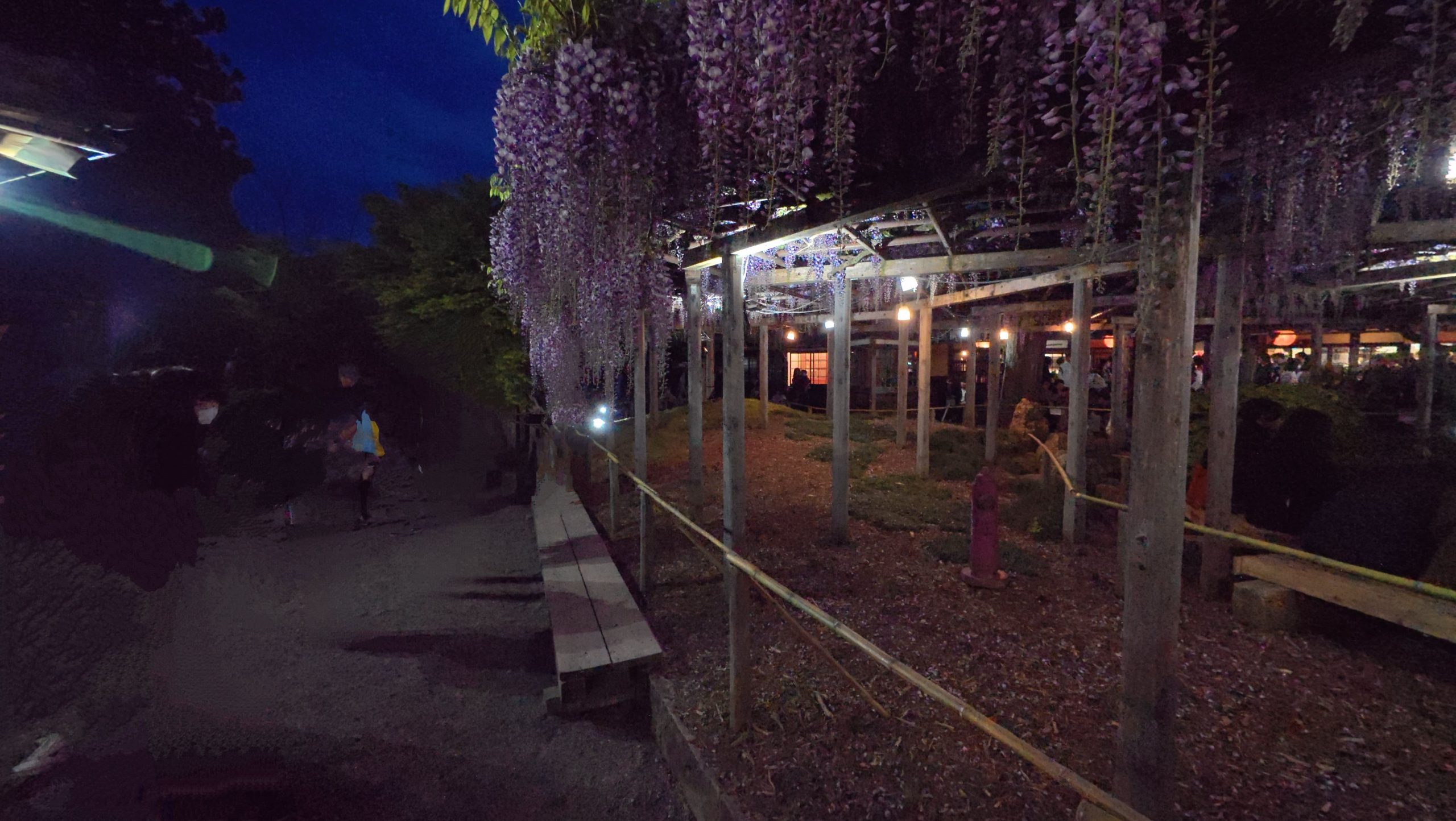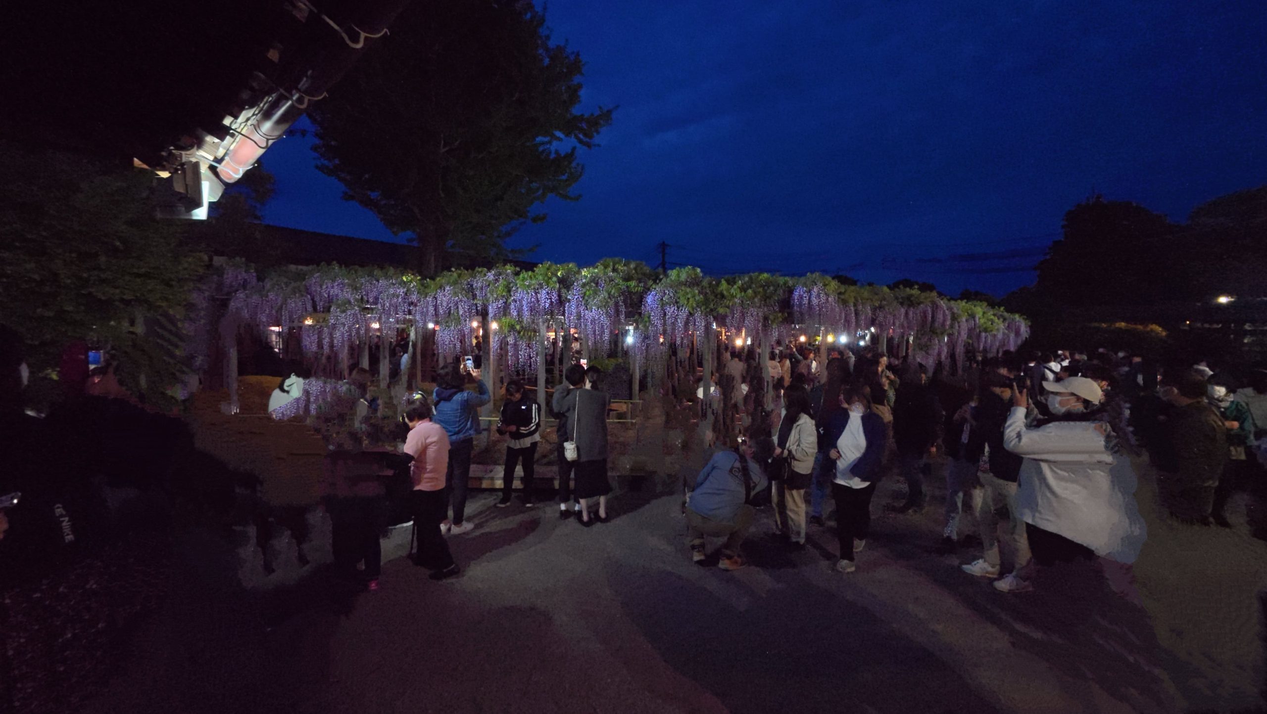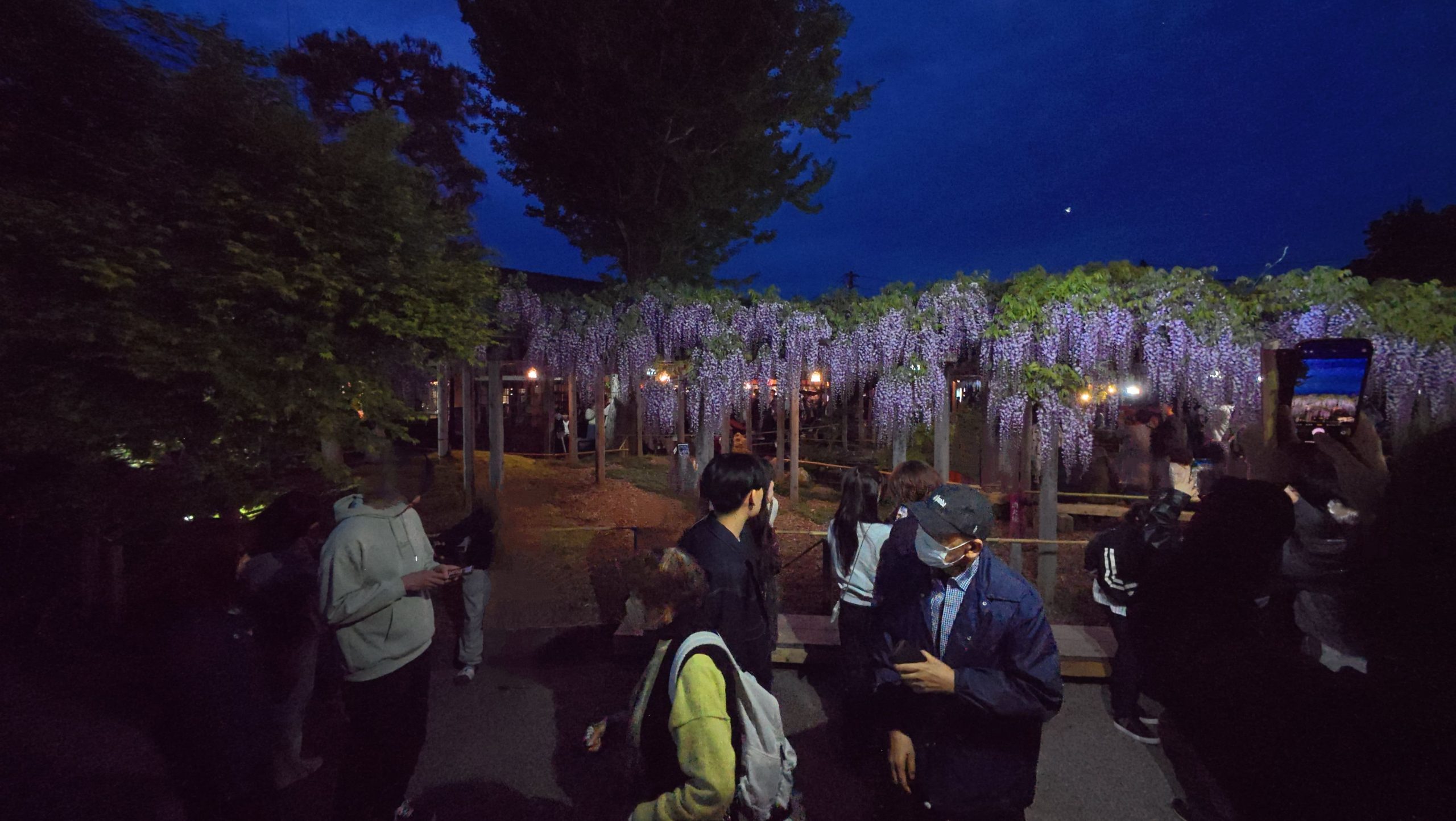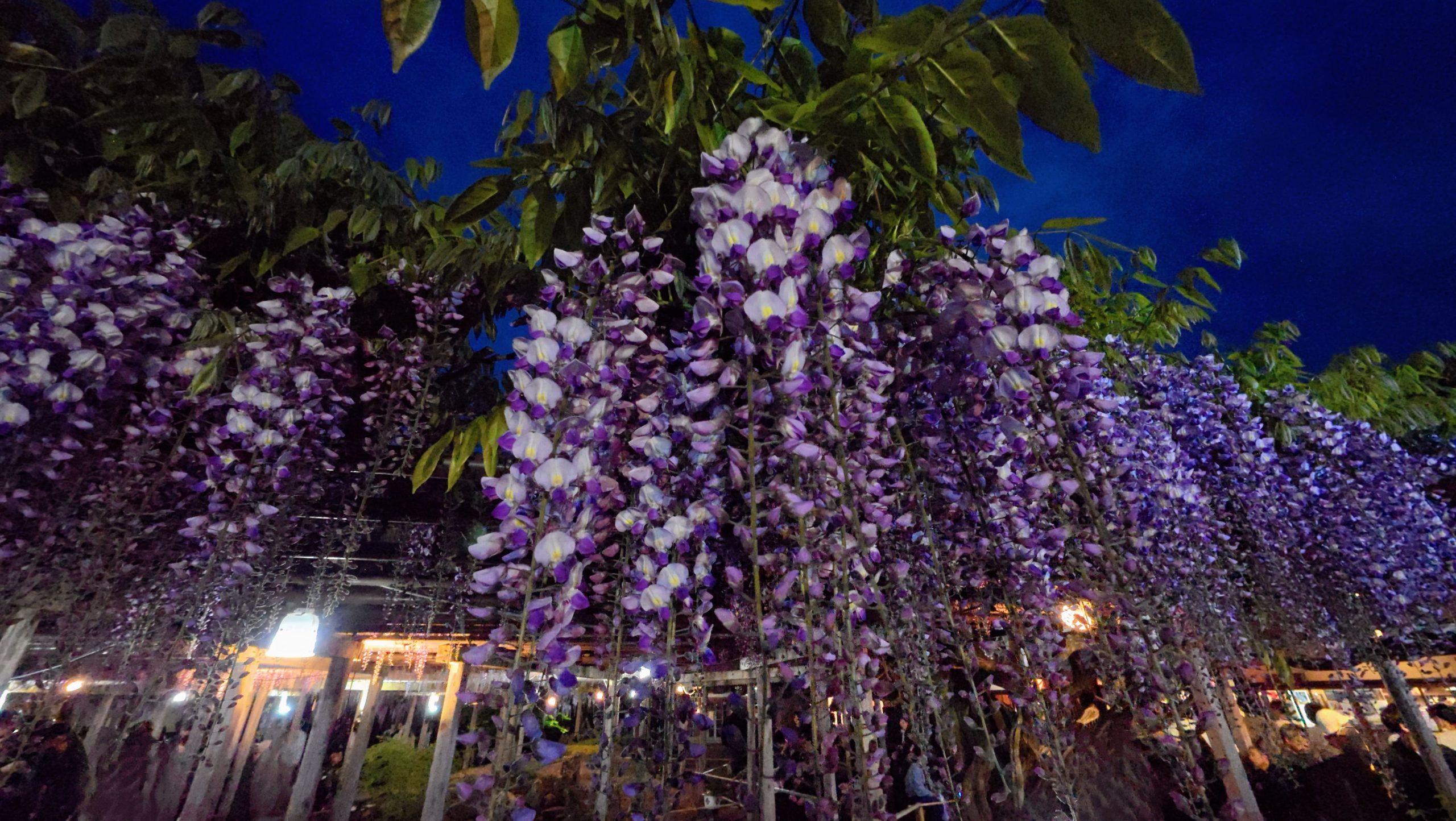 甘い香りを放っており、藤色の花はライトに照らされて幻想的でした。