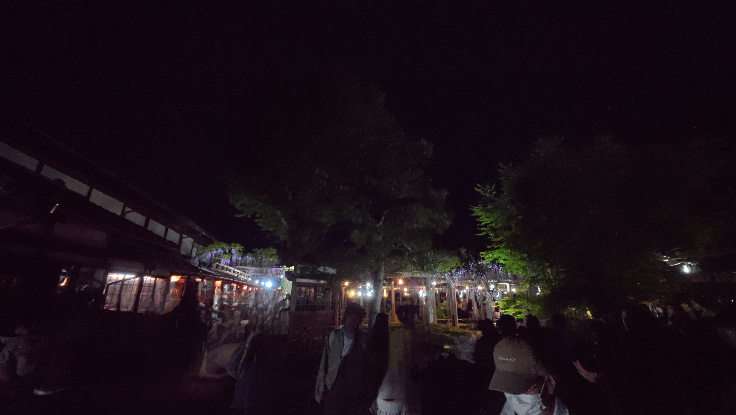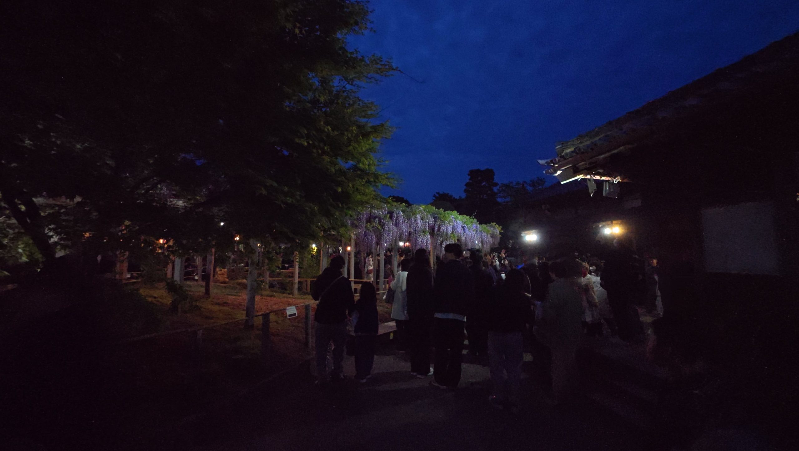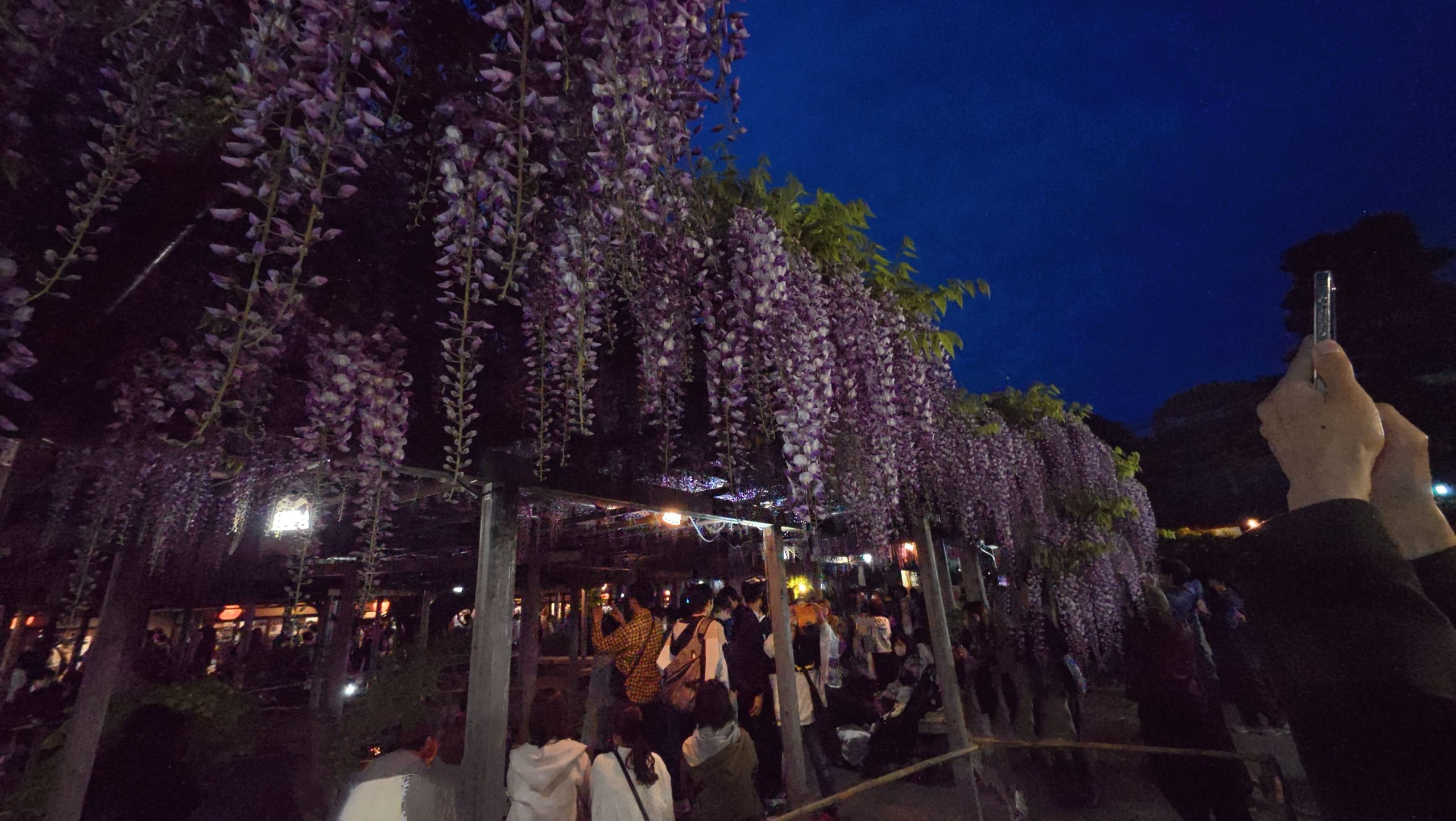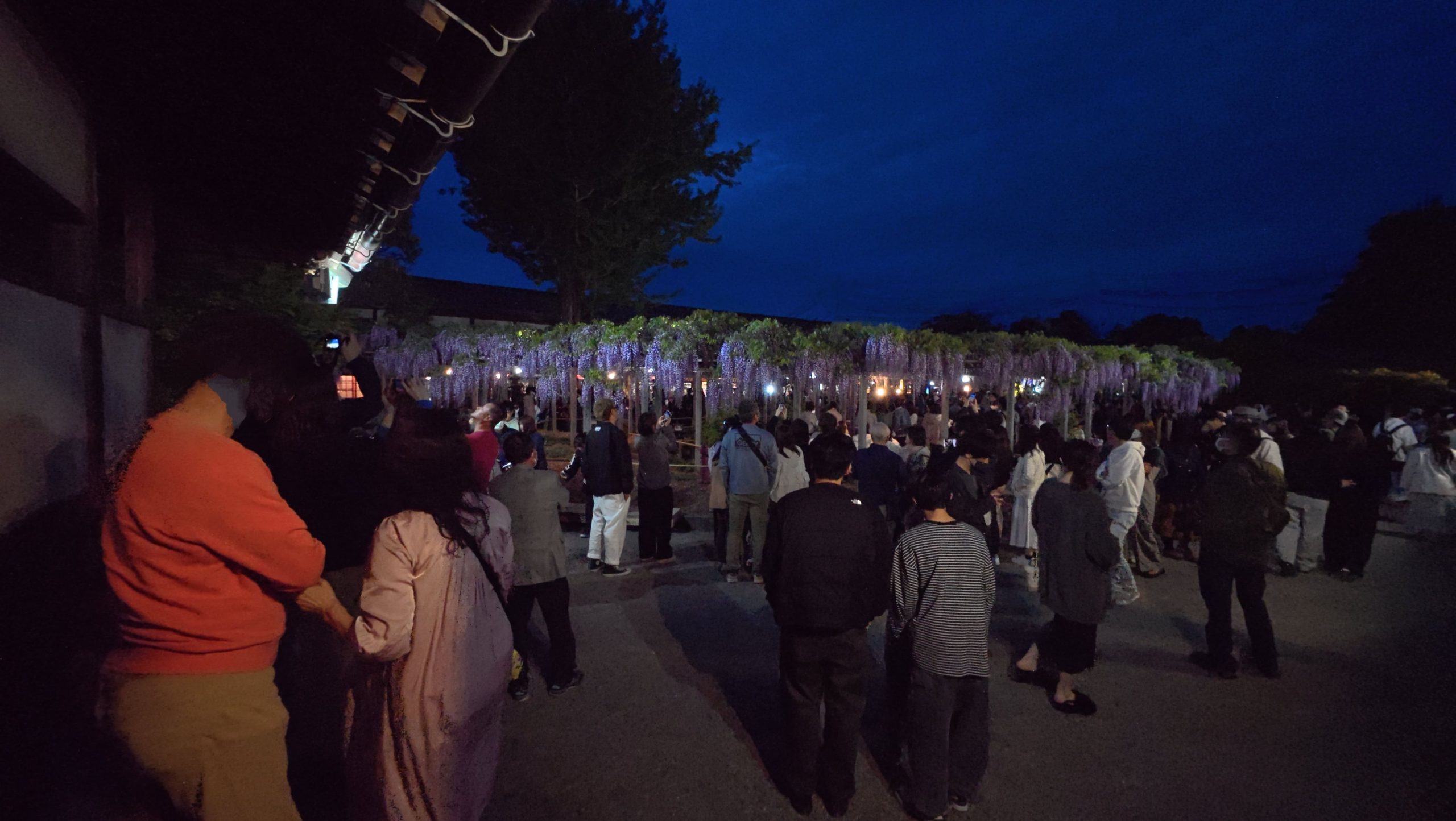 甘い香りを放っており、藤色の花はライトに照らされて幻想的でした。