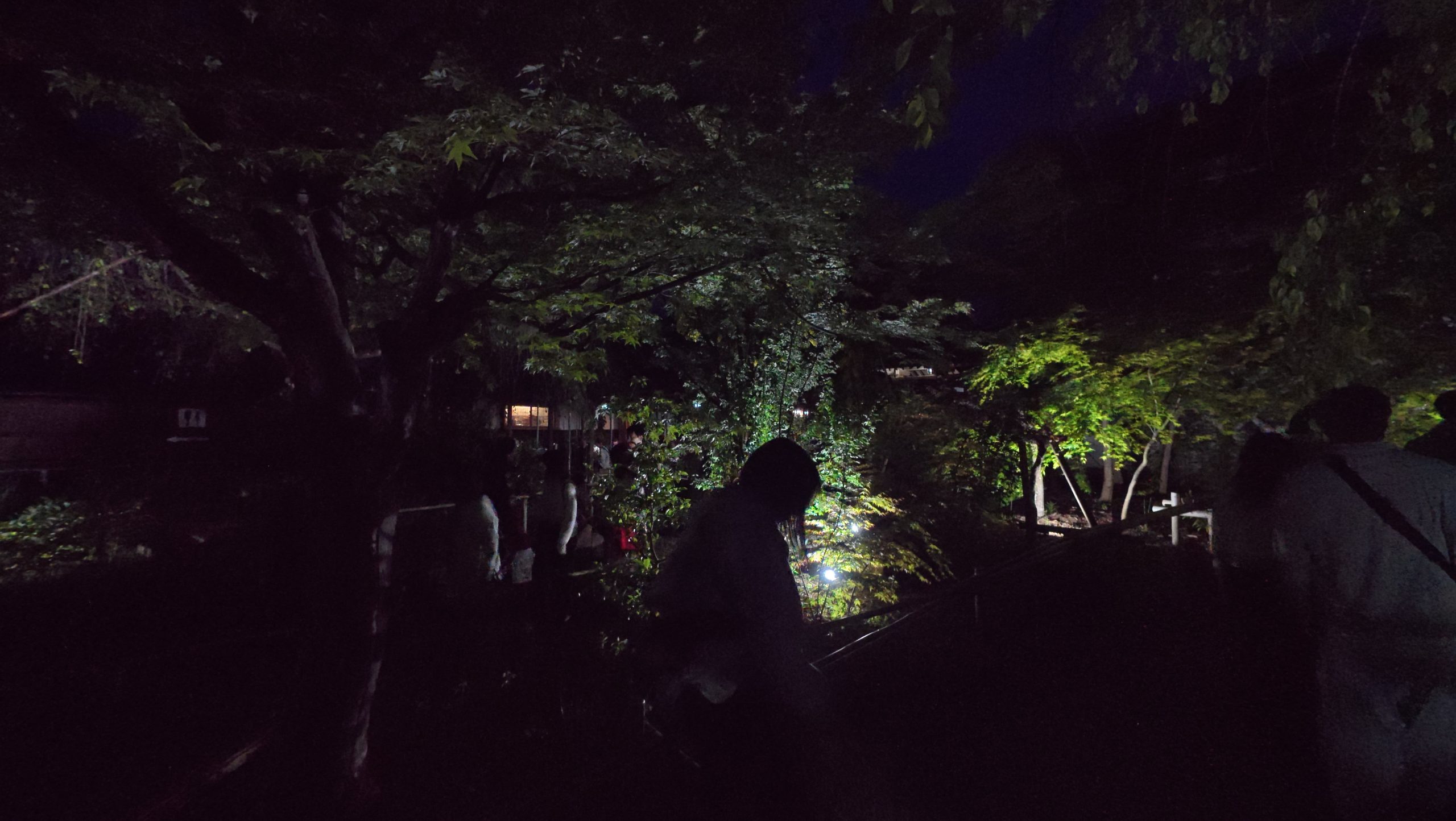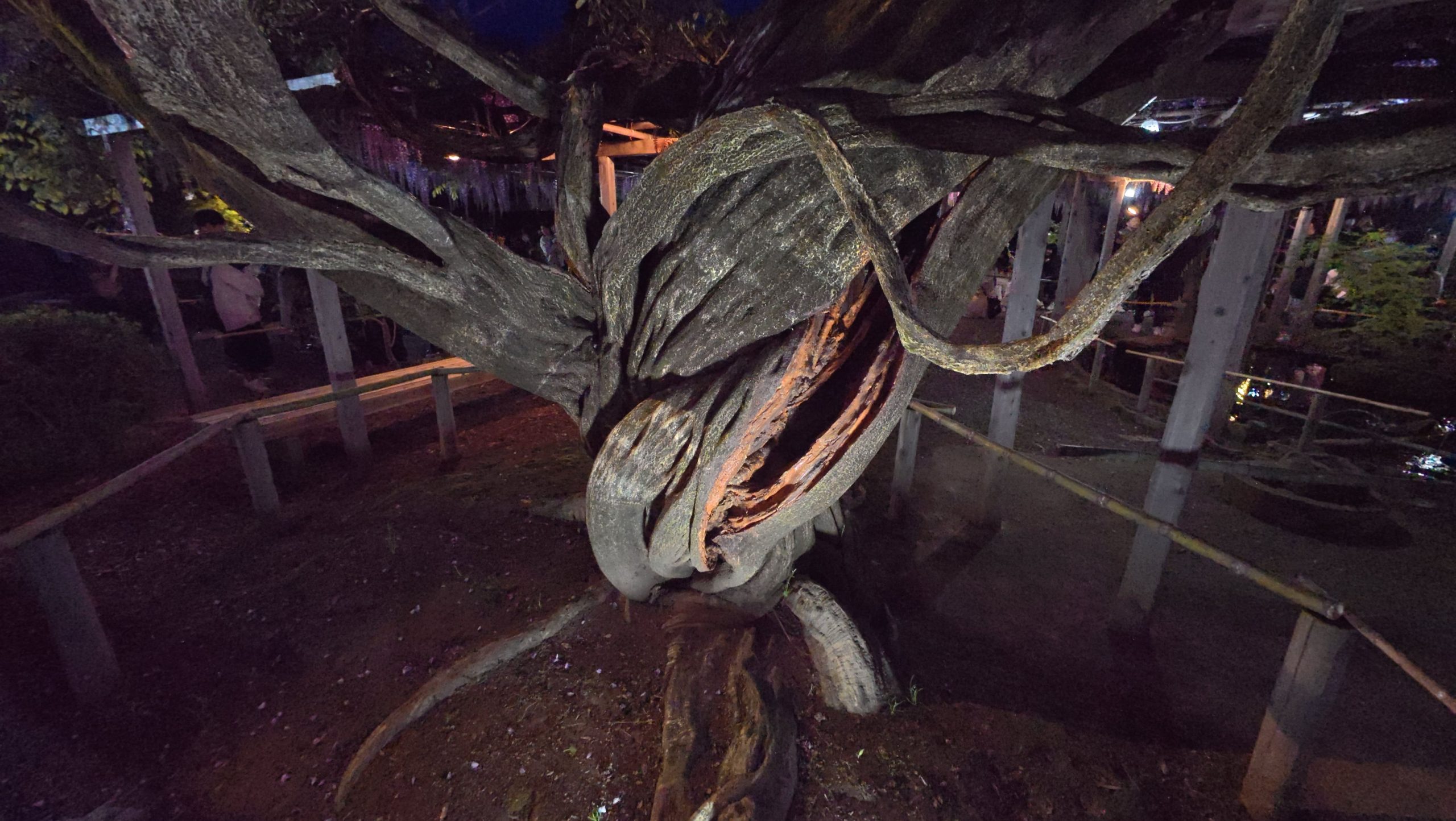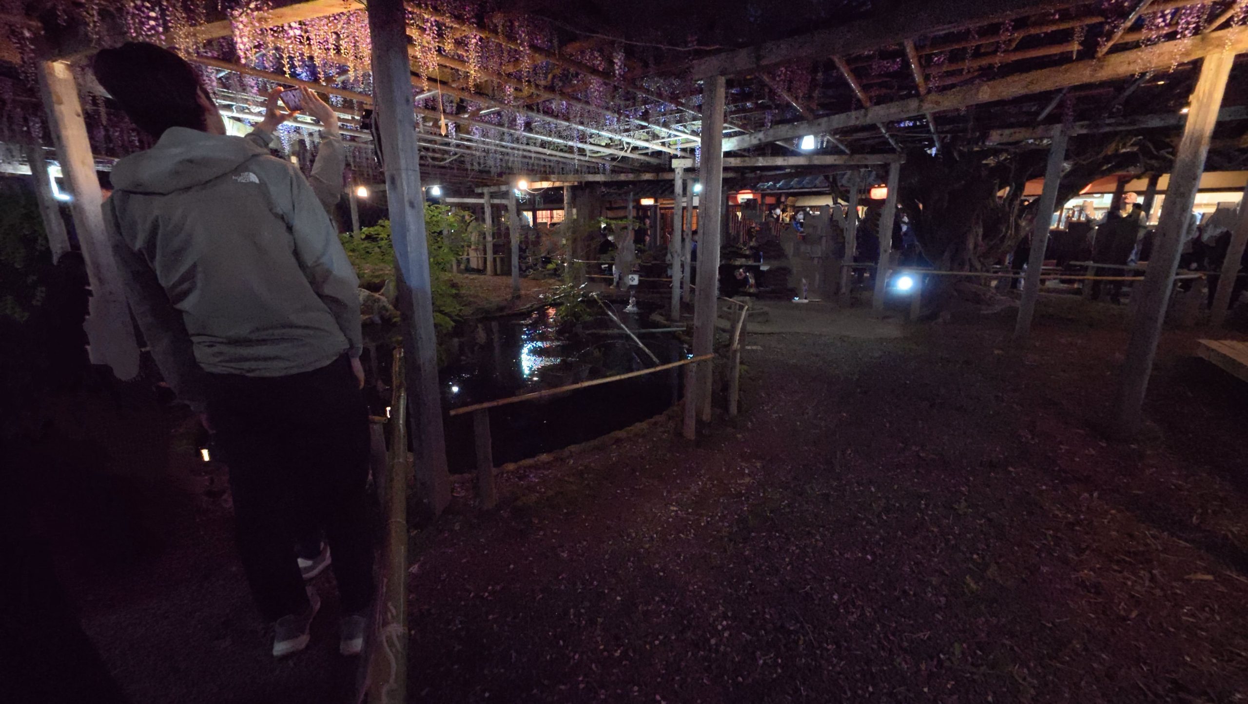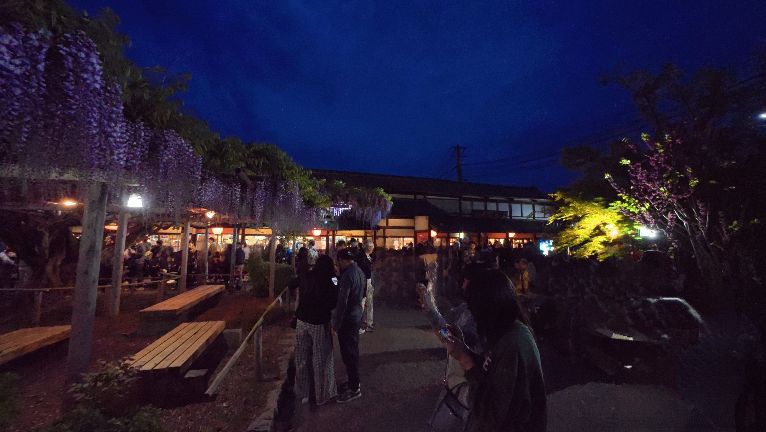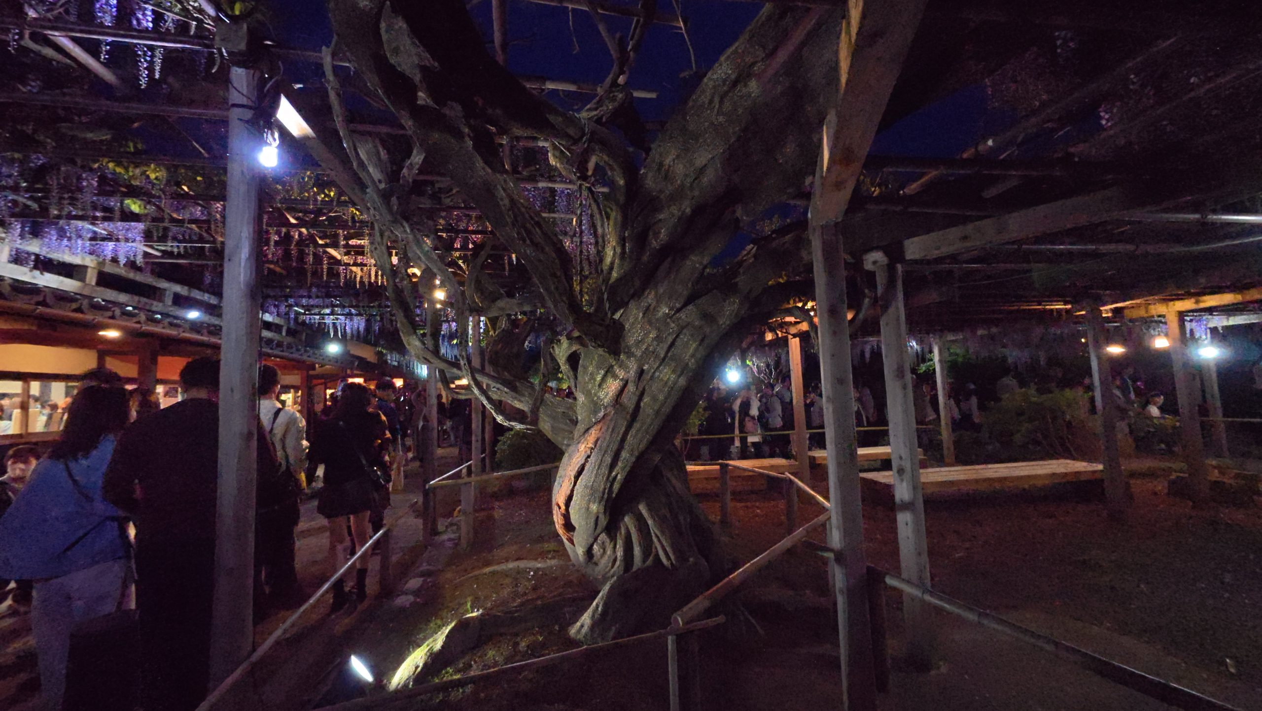 甘い香りを放っており、藤色の花はライトに照らされて幻想的でした。