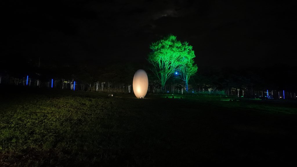 This public art, created by Yasuda Kan, is named Tenpi (Secret of the Sky), which is placed on the lawn at Bandaijima.